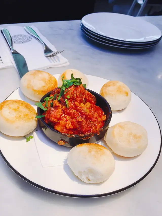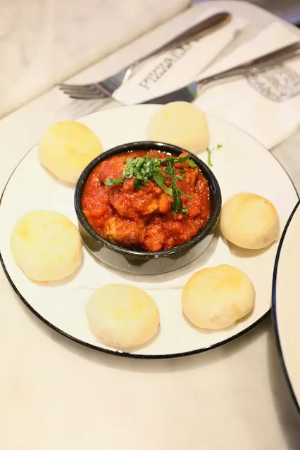 前菜點左意式焗肉丸,餐牌雖然有辣椒但其實完全冇辣味,不過肉醬蕃茄味足,肉丸有肉味之餘幾香口,調味配合得唔錯。跟配嘅麵包球新鮮熱辣,好煙韌