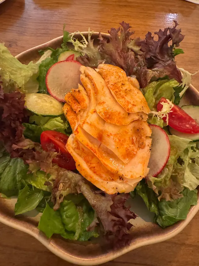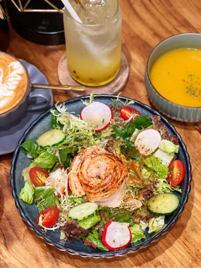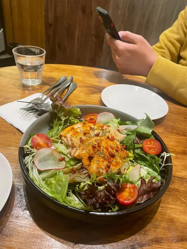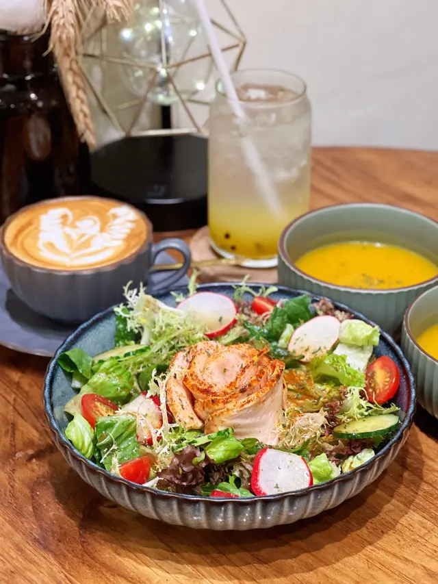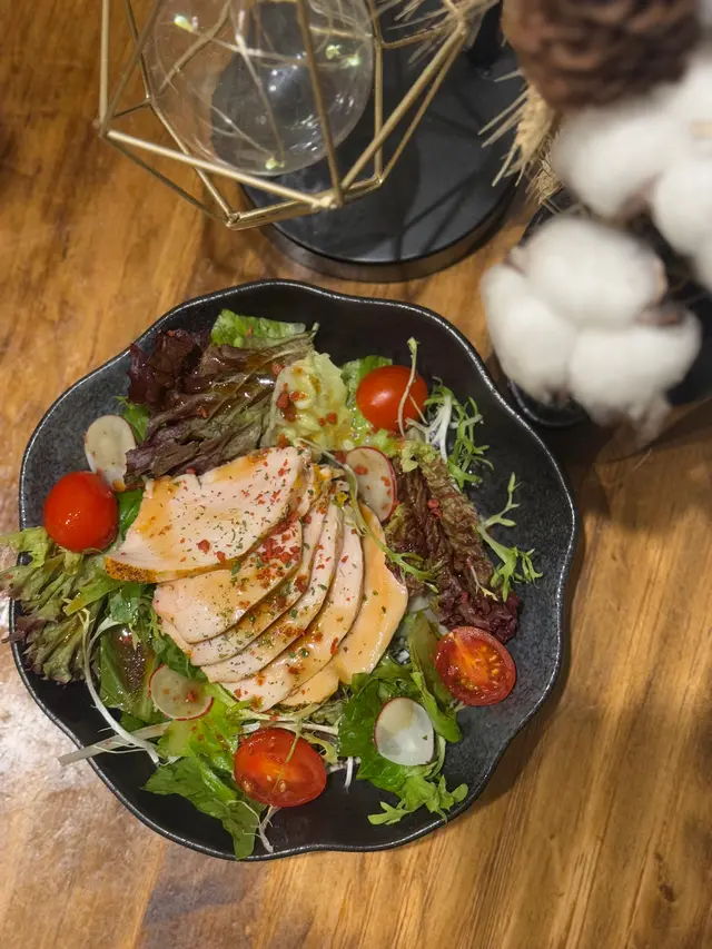 咁新一年梗係要約朋友去啲之前未食過嘅餐廳,但係因為朋友係減脂期,所以可以選擇嘅餐廳其實少咗好多,咁啱俾我喺OpenRice見到呢一間好似都幾唔錯嘅Cafe就去咗試吓因為我和朋友都唔係好肚餓,所以淨係分別單點咗一個意粉同沙律蒜油花椒蜆肉意粉 $108推薦指數🗯️:🌟🌟🌟🌟擺pon擺到成朵花咁樣好靚🌷第一啖食落口比我想像中冇咁油,反而因為有花椒係入面,所以食落惹味好多,蜆肉食落都覺得好鮮甜,而且冇沙慢煮雞胸柚子汁沙律 $78推薦指數🗯️:🌟🌟🌟🌟個雞胸好嫩滑,冇平時食沙律成日食到嘅雞胸咁乾柴柴,配埋柚子汁一齊食好清新,而且食完都幾飽,因為雞胸份量都好多Long black $36推薦指數🗯️:🌟🌟🌟咖啡表面嘅油脂保持得好好,不過我係為咗打卡影相先專登吹開那層油脂🤣🤣味道偏酸少少,不過我最鍾意係佢嗰隻杯,係出面好少見到嘅款式✨整體來講,食物質素和服務態度都好好,氣氛都好溫馨,好適合收工嘅時候食嘢或者飲返杯(佢哋有Cocktail可以叫)另外因為我早到,所以店員見我係到等朋友嘅時候,俾咗啲英文字母我,可以拎嚟癡喺牆上面🤣🤣當個小玩意咁樣以上均是我個人觀感,每個人嘅口味各有不同,所以末必同每個人嘅用餐感覺一樣,如有不同,敬請見諒。…查看更多