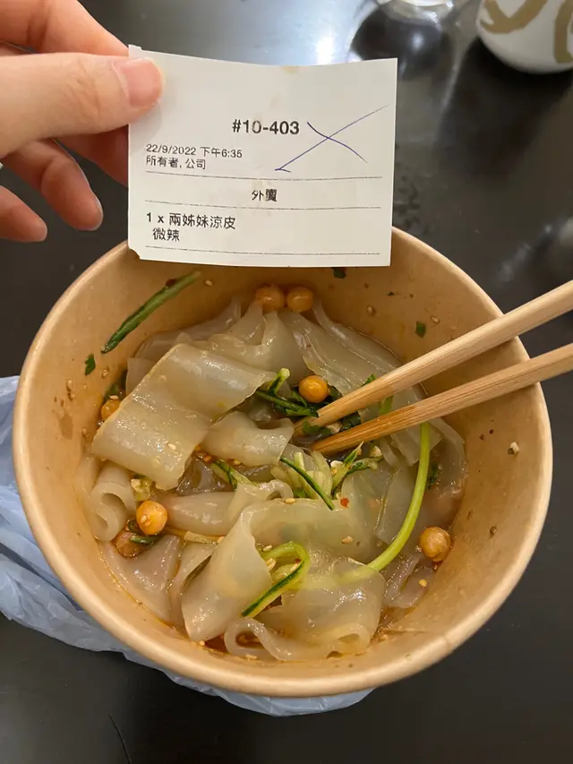 店舖位置頗偏僻,要用心找才見到,店內沒有坐位,一是站立食或外賣帶走,而我選擇外賣回公司。招牌涼皮,另加$11牛𦟌