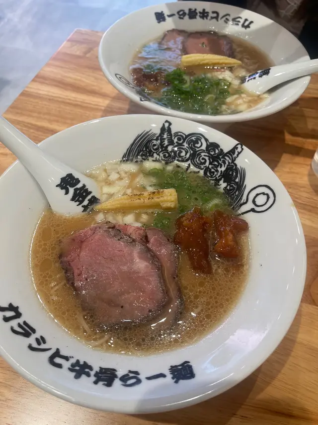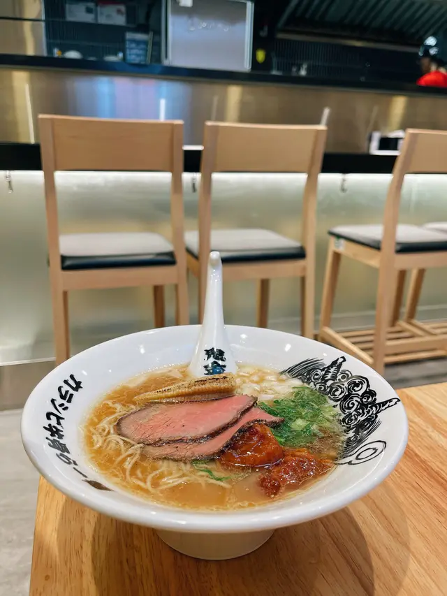 吃過店面是全黑裝修的鬼金棒叉燒味噌辣麻拉麵,知道他們開了另一家牛骨主題拉麵店,當然不能錯過。明亮光猛的風格跟另一家完全相反。除了用大量牛骨淆煮湯底,還用上牛肉製作牛叉燒,更有A4和牛選擇,當然兩款都試啦!招牌牛骨拉麵 $135一來當然吃招牌!拉麵有兩片牛肉叉燒,牛筋及蔥。牛肉片做到叉燒的模樣,medium well的狀態,肉質甚有驚喜。乳白色濃厚creamy的牛骨湯,加了洋蔥原來更甜,沒有辛辣感。粗身的拉麵爽口彈牙,更易掛濃厚的湯,每啖都吃到牛骨精華,正。特上A4和牛辣麻牛骨拉麵 $165用上A4和牛所以價錢會高一點,還有牛筋、粟米及蔥作配料,加上橙啡色湯底,色彩鮮亮吸引。A4和牛雖薄但有兩大片,肉質相對柔軟,牛味濃厚帶香氣,正。選了小麻小辣的辣麻牛骨湯,十分惹味。牛筋 $35雖然拉麵配料也有少量牛筋,但我們還是點了小食版。因為這樣才吃到它原本的味道!牛筋炆煮得超軟稔,黏黏的骨膠原,還有一點肉吃,份量又不少,我們都很喜歡。這夜的晚餐是牛的盛宴,牛骨湯、牛肉叉燒、A4和牛及牛筋全都吃了,好滋味。…查看更多