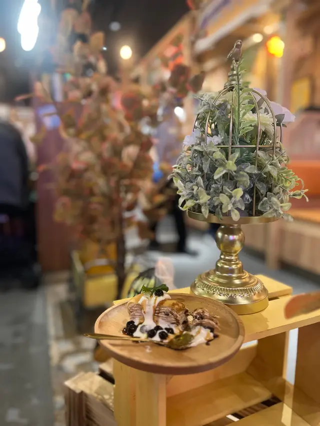天花佈滿乾花裝飾的台式輕食咖啡店,設有打卡位之餘價錢還很合理。而且有好多選擇,如台式主食、火鍋、便當、特飲花茶、甜品等等🚂 鐵路便當 (配肉燥飯&醃菜&鹵蛋&昆布湯)❋ 台南三寶(鹽酥雞翼&肉羹&台灣腸)$72有五款便當可供選擇,我選了三寶,有我喜愛的台灣腸,鹽酥雞挺酥脆,菜脯和肉燥飯一起吃口感豐富,而肉燥不是全肥,不會太油膩。昆布湯有點清淡但足料。🧆 肉燥高麗菜 $38有少少驚喜,平時不太好肉燥都覺得好好味~🗻 戀 ♡ 富士山(日)<奶蓋藍橙乳酪特飲>(凍)$38賣相像藍天白雲下的富士山🗻底層是藍橙乳酪沙冰,在上面鋪上奶蓋,增添了不同的層次感。☕️ 草莓百香果紅茶(熱) $48採用阿薩姆紅茶、錫蘭紅茶、祁門紅茶以及大吉嶺紅茶四大紅茶混合而成。附上蜜糖,有點酸酸甜甜的感覺🍰 招牌珍珠奶茶奶蓋千層蛋糕 $48一層層的千層蛋糕,班戟皮好薄好軟熟,加上珍珠煙煙韌韌,有口感又不會太甜,但茶味不算太重。🥛 3.6 牛乳黑糖芋圓特盛 $88(手工QQ芋圓,3.6牛乳黑糖沙冰,香草雪糕,珍珠,黑糖紅豆麻糬,牛奶布丁,紅豆)十分豐盛的芋圓特盛,非常足料,份量都挺多,其中三色芋圓甜度都不高,有煙韌口感,還有奶味重的牛奶布丁都很不錯。…查看更多