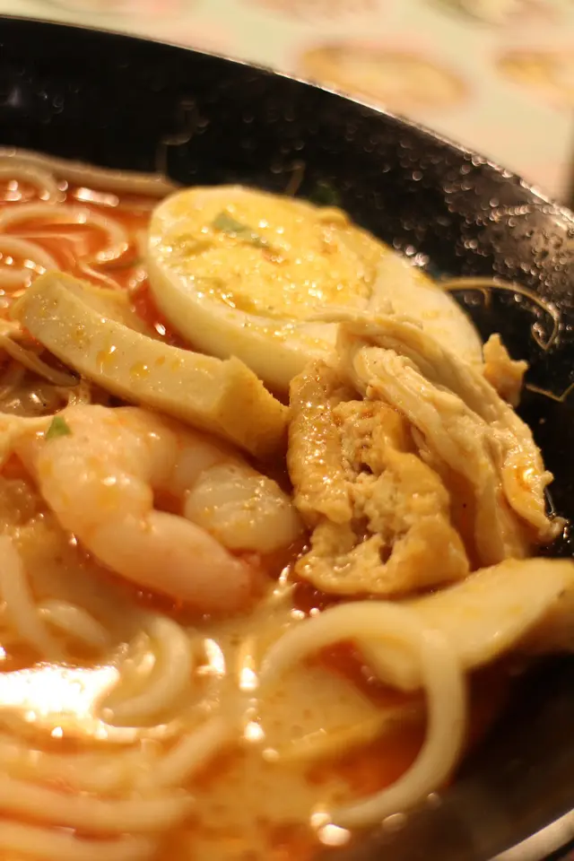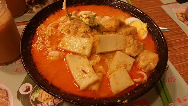 之前朋友推介有間食喇沙很正但很多人的餐廳, 這天特登早點飛撲過去試試, 還未到12:30pm 已經有一兩組人在等位, 還好吧, 等了十分鐘就可進去這餐廳只有九款食物推介, 很適合我這些有選擇困難的人, 嘻嘻!在門口等的時候已想好了吃什麼, 甫坐下就即刻點餐了~我點了星加坡喇沙($47),另加$7 配飲品.看餐牌上這款是微辣, 但看到湯面全是紅色就嚇一跳, 不過辣度是可以接受的配料也頗豐富, 有雞肉, 魚片, 蝦, 芽菜和蛋, 配的是油面, 湯很香濃, 超惹味的加錢配的凍奶茶配咖啡珍珠, 珍珠像西米, 奶茶比較淡, 而且很細杯...吃到火辣辣之際...不消一回便喝完...還好店內有檸檬水供應總括內說, 這店很吸引我這個麵精, 環境平較窄但算乾淨簡潔,服務太度不錯, 下次再來試試其他食品 …查看更多