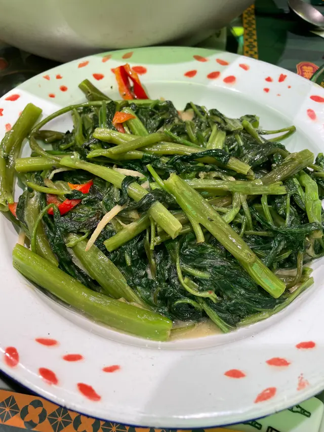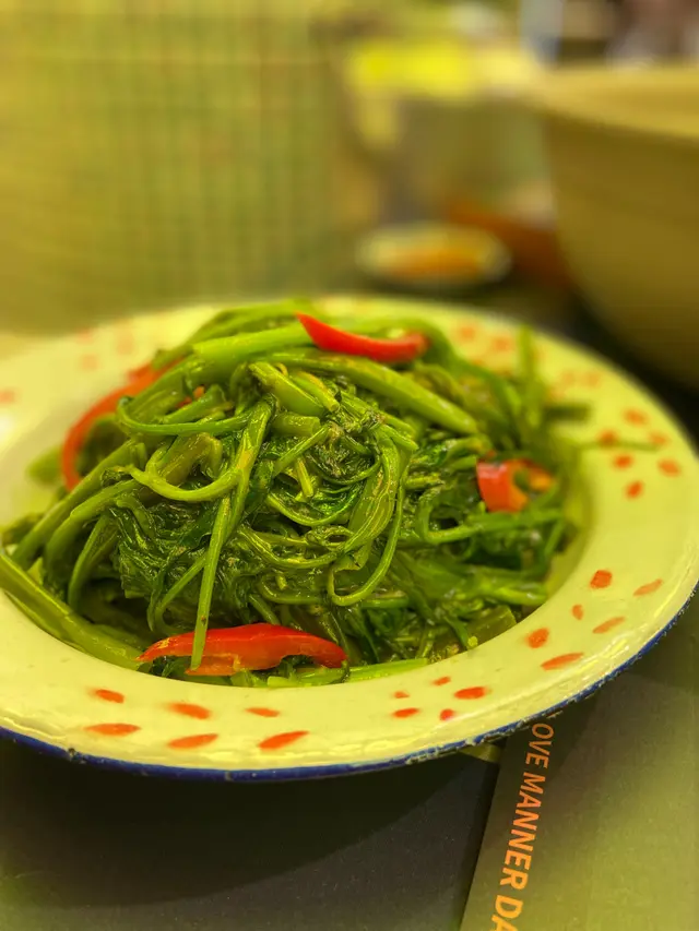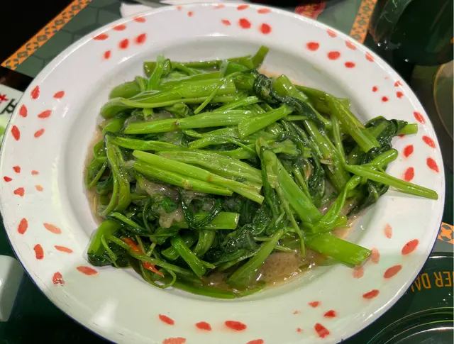 發記大香腸,上菜的時候想不到是原條吊著上的,這樣的上碟方式太特別了,香腸本身有少少胡椒味,再配著它的醬食,好惹味~椒絲腐乳通菜,這是今晚最好食的一道菜,炒得好有鍋氣,腐乳汁掛滿每根通菜,好入味