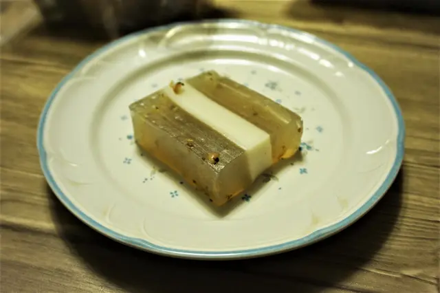 兩層桂花糕夾一層椰汁糕,所以,賣相好睇,桂花都睇得出落唔少,所以,桂花糕部份好有自然嘅桂花香氣,淡雅清幽,糕身亦好有彈性;而椰汁糕部份,椰香十足,兩者估唔到都以夾。