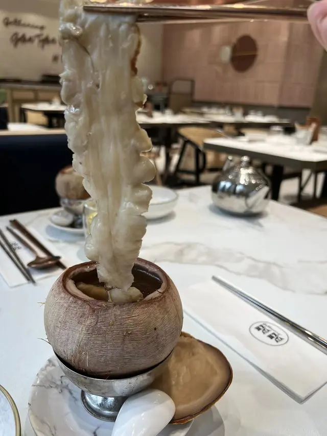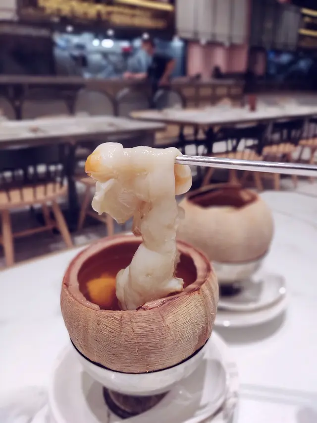 早幾日買完餸經過見到呢間新開張,食100送100現金券,好吸引於是馬上訂位!入到去比我感覺係裝修非常雅致新派,完全唔似傳統中菜館!長方枱很有西餐廳風格,看了餐牌樣樣都想試,於是便叫了兩人套餐!一坐低先來店員先送上一小杯冰凍椰皇水及一杯熱辣辣嘅玄米茶,冰火交融很爽!跟套餐仲有玫瑰荔枝冷泡茶同白桃烏龍冷泡茶,超香好飲!餐前開胃小食冰鎮荔枝蕃茄,擺設精緻,荔枝的香甜中和咗蕃茄的酸甜,味道唔錯!椰皇燉珍寶花膠~未打開蓋,看似平平無奇的一個椰皇,一開蓋,清香撲鼻,望非常足料,主角花膠又長又厚!有肥大雞腳又有豬瘦肉湯色清澈少油,飲落清、鮮、甜,完全是靚料經長時間燉出嘅精華所在;椰王肉吸收哂湯汁,刮出來吃都係至高享受!紅油伴魚翅餃~雖然只兩隻不多,但擺設精美!魚翅餃內有紅蘿蔔西芹木耳豬肉,食落有蔬菜的爽口,點上紅油同吃,滋味無窮!香草金稻帆立貝~顧名思義即係有米,脆米的香脆加上炸過軟淋的茄子墊底,放上一粒煎到恰到好處的珍寶帆立貝!再淋上秘製日本芥辣沙律醬,口感層次非常之豐富,勁好味!😋霸皇沙巴仔~擺盤非常架勢,大廚刀功細膩,去骨起片,保留頭、尾及兩邊水撥,條沙巴好似曉飛咁,超生動!面頭鋪上三色椒粒、蔥花和青花椒,令顏色及味道同樣出色、蒸魚豉油加了少許花椒油,微微辣更添風味,有創意!魚肉白滑而鮮嫩,成塊夾起而不散,咬落鮮甜,足証是新鮮靚魚!最正是墊底嘅粉皮,完全吸收哂條魚同配料加上豉油嘅味道,同用魚汁撈飯有異曲同工之妙!火焰脆皮豬手,差不多每枱都點,皆因用鐵板上桌,淋上酒精然後點火,非常吸睛;吃落皮脆肉酥,但又不覺肥膩!三種醬汁都非常夾,好食到停唔到口呢!開胃銀絲王,濃湯浸嫩嫩嘅娃娃菜,湯中放入兩條泡椒,浸出些微辣味,真的特別開胃,又可夾多兩件豬手食呀!食到尾聲,送上不一樣的[梨]又係看似平平無奇,一切開內裏的燕窩流晒出嚟,非常之有驚喜,清甜滋潤,食完即刻覺得皮膚靚晒!仲有靚靚[聚甜三小碟]甜品,芝麻糕、桂花糕、手工蛋白杏仁茶同椰絲脆麻花,作為呢餐完美的終結!…查看更多