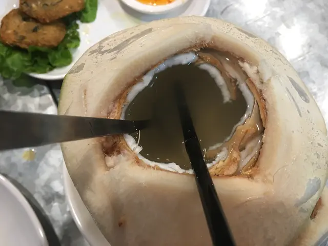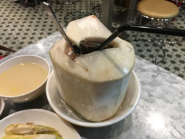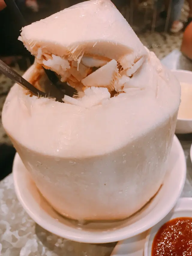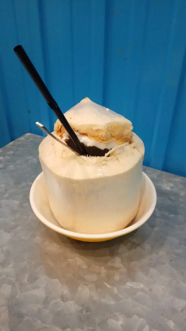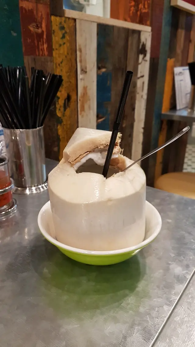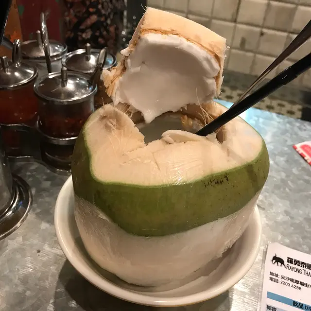 泰式醬燒原隻魷魚筒(左)/燒香茅豬頸肉(右)佢問可唔可以兩樣放埋一齊,why not~魷魚一啲都唔韌,仲軟軟地,沾個酸酸甜甜泰式醬,好食~豬頸肉切得薄薄地,都燒都幾乾身,但食落唔乾,一啲肥肉都冇,好評~椰青食泰國野配返個冇加工糖嘅椰青就最正,仲可以挖啲果肉食,非常清甜解膩,唔係一般飲品比得上!