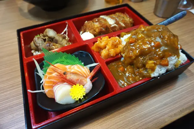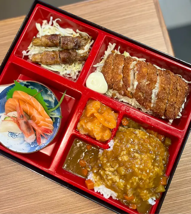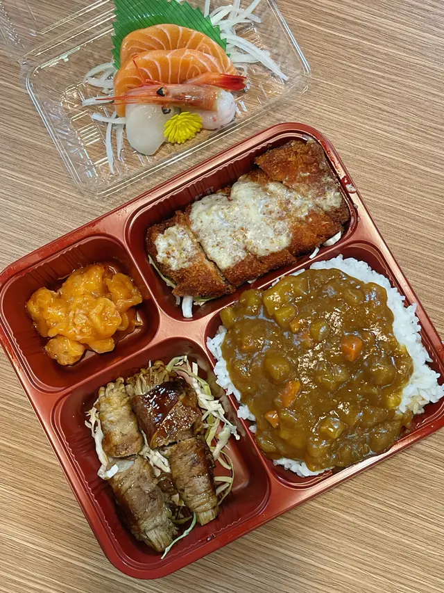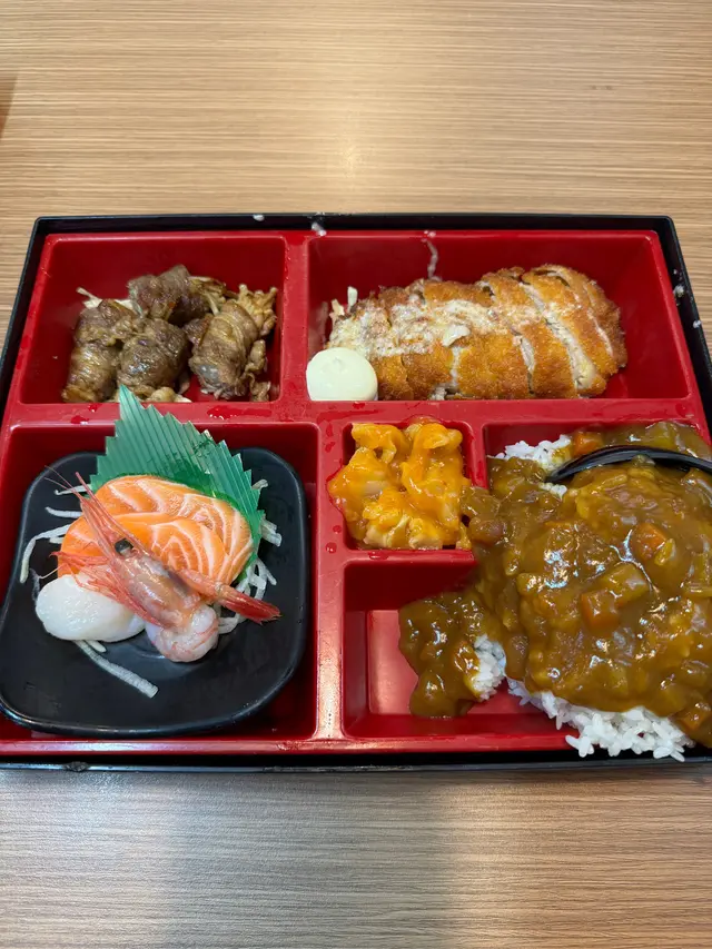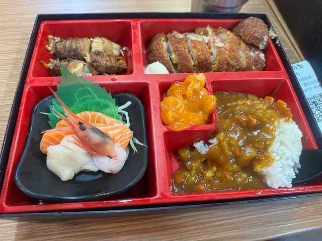 放假同媽咪去葵芳街市買餸, 順道係附近食個lunch。經過呢間餐廳門口, 見menu上有唔少便當、丼飯, 款式吸引, 價錢唔貴, 就入咗去食個lunch。餐廳地方企理。黑松露三文魚壽司:三文魚壽司上以黑松露點驟, 魚香中帶點松露清香, 不錯。沖繩便當:便當款式豐富而且份量多!吉列千層芝士豬扒, 吉列皮香脆, 入面卷住嘅豚肉片嫩滑, 沾咗熱溶了嘅芝士汁, 更為香甜, 帶出鮮肉味。汁燒金菇牛肉表面煎得帶少少焦香, 肉汁滲於包住嘅金菇入面, 口感層次豐富又富有肉香, 正!自選了咖哩飯, 個咖哩甜甜地, 咖哩味好重, 撈飯食超正!便當配有味噌螺肉同埋三款刺身各二, 包括有三文魚、帶子、甜蝦, 每款都好新鮮冇腥味。套餐 +$24 追加唐揚魷魚鬚:估唔到追加嘅份量都咁多, 炸皮薄而酥脆, 魷魚鬚爽口彈牙, 配千島醬食, 味道更提升。特選三色丼: 集合了三文魚、蟹籽同埋帆立貝嘅刺身丼飯, 帆立貝鮮甜, 將蟹籽混入珍珠米飯食, 每啖更鮮味更有口感層次; 套餐更附有口感滑嫩、味道鮮美嘅茶碗蒸同埋小食味付螺肉。…查看更多
