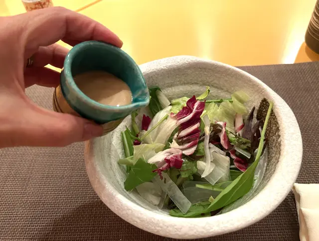 今午一家人去尖沙咀香格里拉酒店地庫的日本料理, 灘萬日本料理, 吃午餐. 女接待員穿上和服招呼, 感覺這餐廳好有傳統文化.餐廳內有日式擺設. 面積大, 座位多, 燈光悠和.分別設有壽司吧檯, 和鐵板燒檯.我們訂了鐵板燒, 安排座位自成一角. 午市餐牌, 定食簡單易明. 大家分別點了鐵板燒, 海鮮定食及美國牛柳定食. 頗豐富. 有前菜, 沙律, 三文魚刺身, 主菜鐵板燒, 素菜, 雞蛋炒飯, 漬物, 麪鼓湯, 雪糕或茶.先來開胃沙律. 沙律菜新鮮爽脆, 加上胡麻醬汁. 入口酸甜開胃.前菜, 烘多士配蕃茄, 非常脆口.三文魚刺身, 切得厚厚的, 肥美好味.在鐵板燒旁用餐, 可以欣賞大廚烹制過程, enjoy !主菜鐵板燒, 雜錦海鮮, 有三文魚, 蝦, 魷, 銀鱈魚. 師傅把表面煎至金黃帶脆, 肉質柔軟, 口感鮮嫩. 另一主菜鐵板燒牛肉定食, 鐵板燒美國牛柳, 這火焰表演不錯啊!鐵板燒美國牛柳, 口感柔嫩軟滑, 油脂均勻, 牛味香濃. 炒素菜, 簡簡單單, OK!漬物, 麪鼓湯, 雞蛋炒飯, 一般也 OK.最後可揀雪糕或茶, 我選綠茶雪糕味道好好. 家人叫熱檸茶, 也不錯.最後服務員送上生日蛋糕, 又替我們拍照片, 招呼頗好.…查看更多