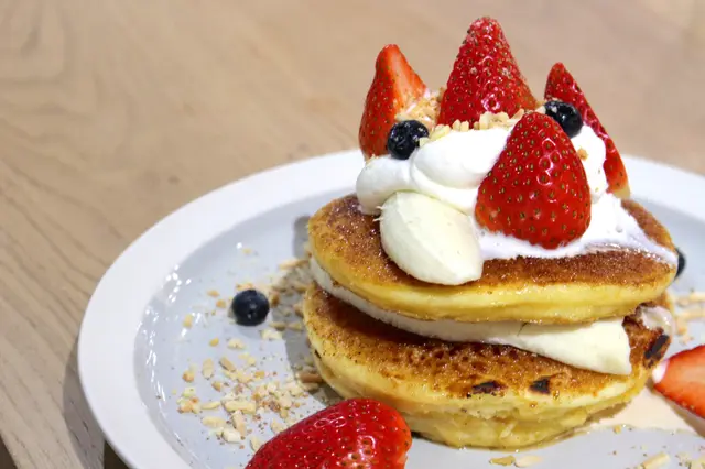 材料有藍莓、士多啤梨和香蕉,班戟質感鬆軟細密,外脆內軟,濃濃的牛油香加上忌廉,絕對是一個出色的配搭。