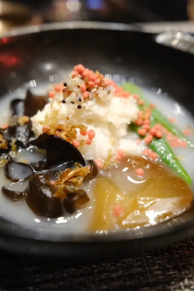 獅房菜(Lion Rock)位於旺角帝京酒店內,是間全新中菜概念餐廳🤍 餐廳擁有超大的落地玻璃窗,可以欣賞到獅子山壯麗的景觀🤩 而且裝潢華麗高雅,高樓底的設計盡顯氣派✨最近獅房菜推出以唐詩為主題的「獅房發辦•唐詩宴」,巧妙地將詩人的情懷與景致融入佳餚之中😍 套餐共有9道菜 (優惠價:HKD638/位,2位起),另提供12道菜單選擇👌🏻🤍柚香冷麵.荷燻鯧魚.紅菜酥頭盤以乾冰營造出仙境般的視覺效果🤩 三款菜式包括開胃的柚香冷麵 <槐葉冷淘-杜甫>、酥脆可口的荷燻鯧魚 <齊安郡中偶題-杜牧>,以及香酥惹味的紅菜酥 <早春呈水部張十八員外二首-韓愈> 😋🤍流金沙.脆鮑魚 <金縷衣-杜秋娘>鮑魚披上金縷衣,非常香脆✨ 而爽彈的鮑魚鮮味十足,配搭微辣的鹹蛋黃醬汁,非常惹味🤤🤍花膠.元貝.鰂魚湯 <陪鄭廣文遊何將軍山林十首-杜甫>味道清甜的鰂魚湯,加上Q彈的花膠、鮮美的元貝及白菜,滋潤養顏☺️🤍比目魚.柿紅汁 <蘭溪棹歌-戴叔倫>金黃焦脆的比目魚,肉質嫩滑,配搭酸甜微辣的柿紅汁,很開胃👍🏻🤍阿拉斯蟹盒.黑金蒜頭 <從軍行七首-王昌齡>蟹盒內除了蟹肉外,還有鮮蝦及雜菌等😍 外皮酥脆,層次豐富,口感絕佳😋 上面放上原粒黑蒜作點綴,增添香氣🖤🤍鮮檸.茶凍味道清新的檸茶啫喱✨ 清一清味蕾🙈🤍雲南鮮牛肝菌.茅香雛鴿 <春曉-孟浩然>鴿肉皮脆肉嫩多汁,而且還充滿着滷水的香氣呢~🤤🤍極黑和牛尾.金不換 <詠石牛-李白>以蘋果木煙燻的牛尾😍 肉質軟腍,而醬汁亦非常濃郁入味😋🤍海參.秋葵.米湯 <烹葵-白居易>用料十分豐富,以牛奶及白米熬製的湯底清甜鮮美👍🏻🤍抹茶.紅豆.麻糬餅 <相思-王維>外皮鬆脆,裡面包着香甜的紅豆蓉及濃郁的宇治抹茶蛋黃,甜而不膩☺️ 而旁邊還有可愛的小熊朱古力及清甜的玫瑰凍糕,為這頓盛宴畫上完美的句號🥰📍獅房菜 - 旺角太子道西193號帝京酒店3樓…查看更多