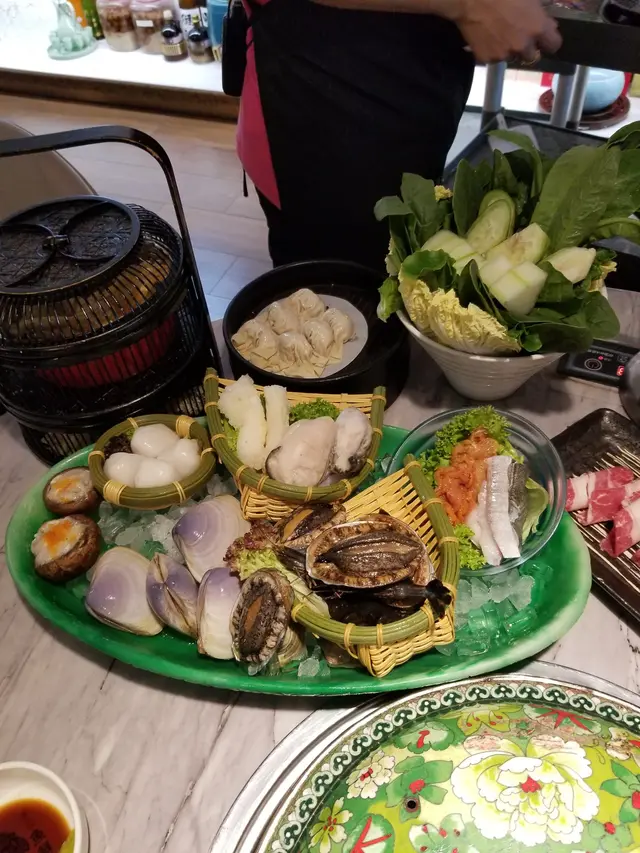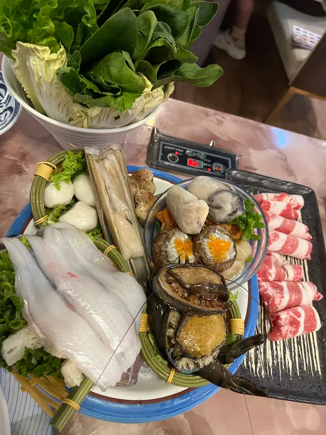 這家店主打圍桌慢吃。入座先是小食圍盤,酸辣甜鹹一圈轉齊,花生、海蜇、海螺、炸雞翼、蝦多士、特色皮蛋各有角色。最吸睛是刺身船,三文魚、吞拿、帶子、赤貝與甜蝦排開,只上一次,但款式夠多,人人都能試到一片。之後上雞煲,可揀辣或不辣,我們要微辣。雞件啖啖肉,醬香下飯。然後上火鍋。鍋底用自家花膠老火湯,先舀一碗暖胃。海鮮盤隨後登場,也是只上一次:九節蝦、元貝、帶子、象拔蚌、花甲、鮑魚,還有魚片、墨魚,種類豐富。新鮮是亮點,輕汆即起,甜味清楚。配菜亦齊,肥牛、豚肉、手打丸、蔬菜逐樣落。店方備了三十多款醬料,從沙嗲到椒麻,各自調一碗,邊煮邊試,頗有樂趣。飲品有汽水、特調果茶、紅白酒任添,任點任吃無限時,坐到打烊不催客。整體節奏清晰:前菜暖場,刺身亮相,雞煲轉鍋,海鮮作結。若想和朋友慢慢聊天,又想吃得豐富,這裡是一席耐吃的選擇。…查看更多