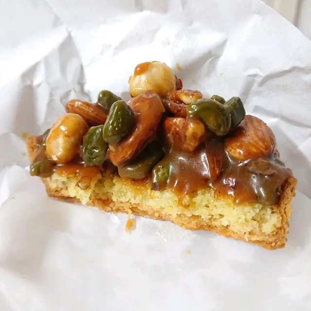 由佐敦店一直買牛角包買到嚟荃灣品質依然超晒班牛角包就例牌買的,最鍾意佢勁脆,又夠香今次再買埋海鹽焦糖果仁撻首先撻面鋪滿晒果仁已經夠晒“吸睛”,所以買嚟試吓😆咬第一口,食到撻邊為主好香牛油味的餅皮雖然上面係充滿焦糖醬同埋果仁但個餅皮都冇“軟淋淋”,仲係硬身,脆的果仁都仲係脆的😂總之成個撻都冇“淋”到食落唔算好甜,海鹽亦中和甜味+帶出焦糖味的層次$38係值呢個價最後想讚吓包住撻果張紙店員包到個撻好好,冇果仁跌出撻皮外之餘食果時就算捉實個撻嚟食,d焦糖醬都唔會沾上張紙食撻最怕食到好輪盡好“呢hae”,有張紙包住又唔會沾醬到周圍都係,食都食得開心d 👍…查看更多