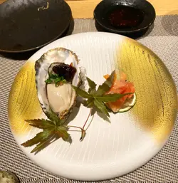 師傅為我們安排的晚餐, 套餐包括前菜, 刺身, 壽司, 熟食 , 甜品. 好豐富.前菜三點, 擺碟吸引, 來個視覺享受.南蠻漬魚 ~ 魚肉鮮嫩, 漬魚味帶酸甜. 胡麻菠菜 ~ 清爽宜人. 核桃魚肝 ~ 香口開胃.白身魚薄切 ~ 擺設亮麗, 金色盛器配上白身北海道 鰈魚, 橙黃色 三文魚籽, 紅玫瑰, 綠色日本葱苗, 蓮芋莖, 增加美感和食慾. 薄切鰈魚沾上柚子皮汁, 好清新鮮甜. 鰈魚 又卷上芽蔥, 口味獨特. 而另一鰈魚內藏有海膽, 口感真豐富. 火炙時令魚 ~ 鯥魚經火炙後香氣迷人.表皮有少焦香, 伴上炸蔥, 三星漬, 感到魚肉細滑, 肥美圓潤. 大拖羅中拖羅三文治 ~ 師傅用火槍把拖羅火炙, 把魚油迫出.大拖羅中拖羅用香脆紫菜夾著, 魚油豐富, 油脂入口帶魚油香, 讓人回味無窮.生蠔配赤貝 ~ 生蠔來自日本四國德島, 赤貝來自日本北海道.生蠔蠔味濃甜, 極之鮮嫩, 師傅加上柚子啫喱. 令口感更清暢. 赤貝鮮甜彈牙, 組合不錯 .和食 ~ 北海道帆立貝配松葉蟹羹, 帆立貝圓潤肥美, 鮮甜有濃郁肉汁, 爽滑感和鮮味在口中綻放. 松葉蟹羹內帶有松葉蟹肉, 入口甜滑更有絲絲蟹香.和食過後, 送上漬物便正式吃開始壽司了. 雜錦漬物 ~ 包括薑, 蘿蔔, 牛蒡. 北海道白玉粟米粟米超清甜, 入口冰涼鮮甜十分開胃. 深海池魚 ~ 肉質細緻爽口, 魚肉纖維幼細味道香甜.北海道牡丹海老壽司蝦醬煆乾 ~ 牡丹蝦鋪上金箔 , 好豪啊, 國際金價上揚, 金箔 閃亮我們看得 出神. 牡丹蝦肉質肥美加上香脆 煆乾, 好有層次感. 更感覺吃得好豪
