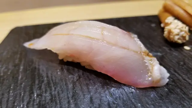 茶碗蒸、4款刺身、7款壽司、雲丹盛、手卷、湯、甜品🔝聞落淡淡嘅黑松露味,仲有金箔做點綴,食到有元貝同本菇,而蒸蛋亦非常嫩滑。🔝聽師傅講右口魚比左口魚嫩滑啲,而且產量亦會比較少。左邊係右口魚刺生,而右邊係右口魚群邊位置,群邊位置輕輕火炙過,令肉質充滿油脂。🔝池魚以火槍輕輕燒過,令油脂更出,帶有微微煙燻味。🔝海膽超級鮮甜😍太都魚天婦羅配海膽都幾特別。🔝呢款唔好食,用拖羅做串燒,勁嚡口。1. 金目鯛壽司