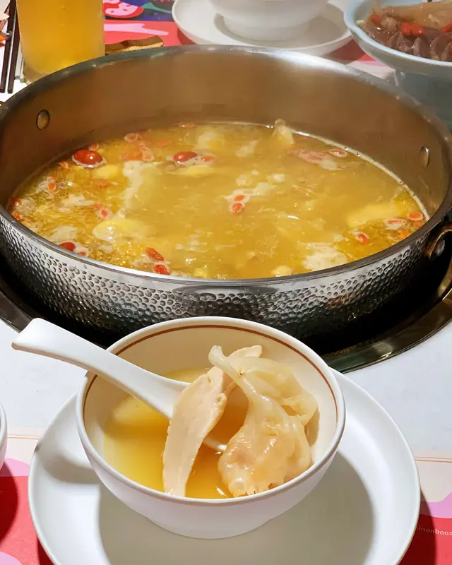 火鍋店樓高2層,旁邊有一小型停車場,店舖擁高樓底間隔,空間感十足,店內裝修玩味氣氛感重,場內處處都係打卡位,包括洗手間都有打卡位👍👍店員服務周到貼心,介紹每款食物最佳煮食時間,仲會提供埋timer計時煮餃子,確保食用時係最佳質素,唔會煮過了頭😋⭐️仲有仲有,必定必定必定要食佢地自家製嘅XO醬,真係好惹味🤗🤗我添加左幾次,仲用黎撈淮山麵食,真係滋味無窮!一坐低每人有一杯Welcome drinks。酸梅湯酸梅湯係自家製的☺️味道酸甜,而且生津解渴,好開胃。湯底滋潤花膠螺片鮮雞鍋標榜無味精,用料上乘,雞件滾左一陣肉質仲好嫰滑,濃郁雞湯加上花膠同螺片,湯底溫潤鮮甜,更充滿豐富膠質,一人飲左一碗雞湯先開始加湯打邊爐。手切靚牛肉牛頸脊 | 封門柳牛頸脊肉質偏瘦有彈性,肉味濃厚和嫩滑;封門柳肉色較深,肉質好柔軟,肉味濃郁,兩款牛肉輕輕一淥就可以食啦!餃子拼盤自創花雕醉雞餃 | 黑松露鮑魚餃 | 鮮蝦雲吞 | 黑豚肉韭菜餃花雕醉雞餃同黑松露鮑魚餃好創新同好有驚喜,味道好突出,而且全部都係手工製作,每一隻都包得好飽滿,皮薄餡靚,味道豐富,每款2粒唔夠喉😂😂新鮮蔬菜拼盤有唐生菜、茼蒿、娃娃菜、粟米、金菇、冬菇,份量十足,每款都新鮮鮮甜。自製脆炸響鈴即叫即炸,將響鈴放落鍋到滾大約3秒就可以食啦,既香脆又滲左少少湯汁,非常惹味~淮山麵以淮山磨粉做麵,口感爽滑彈牙,用火鍋醬料之一XO醬撈勻食,非常惹味!小食麻辣青瓜拌木耳 | 醉牛𦟌青瓜雲耳口感清甜爽脆,麻辣味道刺激,相當惹味。平時食嘅都係醉雞,第一次食醉牛展,酒香濃濃,浸住牛展同牛筋,牛展恰到好處的有軟嫰又有嚼口;牛筋煮得剛好,可以輕鬆咬開但無黏答答,骨膠軟滿滿。雪燕椰汁奶凍玫瑰花造型,非常精緻,係面頭鋪上雪燕,賣相相當吸引,椰汁味香濃,又唔係太甜👍讚竹蔗茅根雪梨水餐廳自家製的竹蔗茅根雪梨水,味道清甜容易入口,可以清內熱、潤燥生津。…查看更多