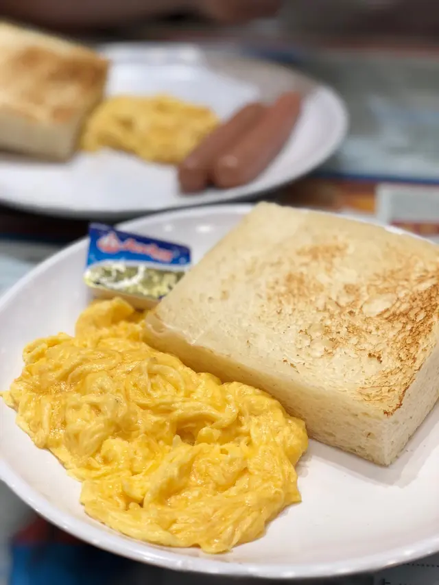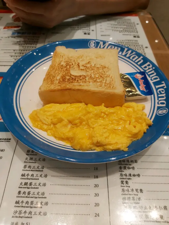 炒蛋就麻麻,不是近年興的炒滑蛋,份量夠。多士有烘過,微熱,入口微脆內軟,幾好。