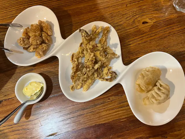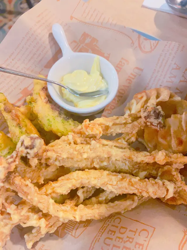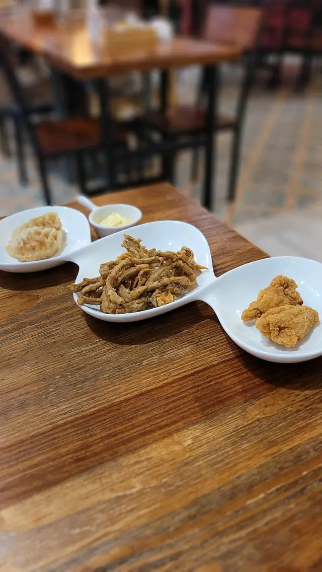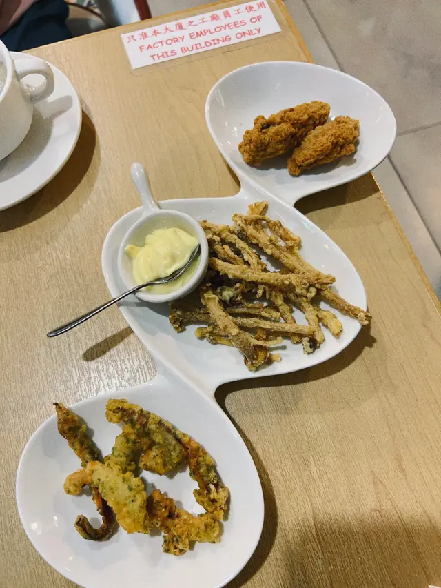 炸物拼盤,總共有三樣唔同嘅食材,包括雞軟骨、魷魚鬚、茶樹菇!個人嚟講就最鍾意炸魷魚鬚,香脆得黎又入味