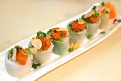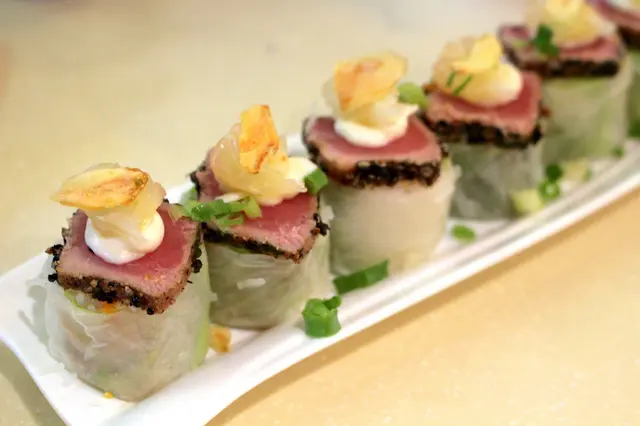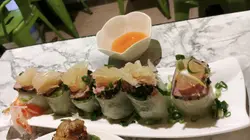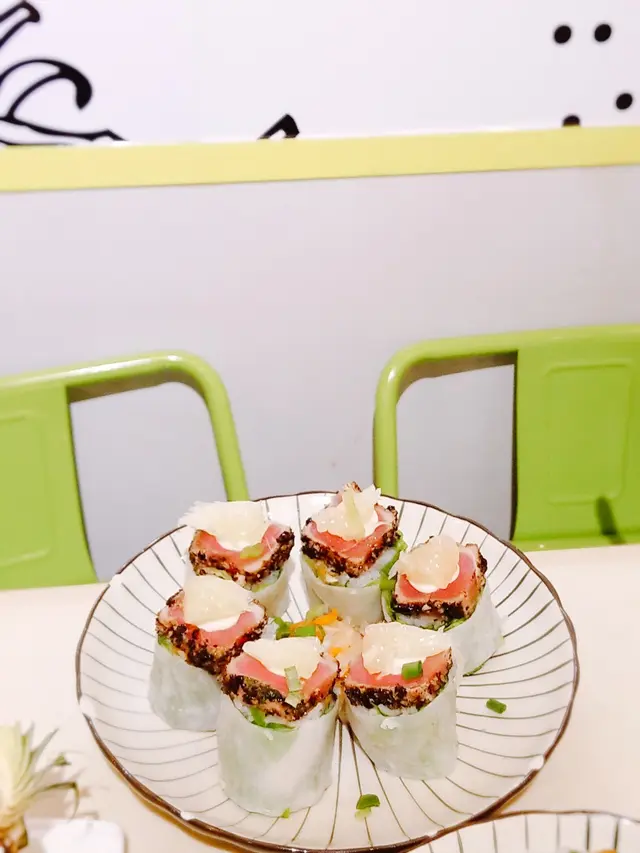 燒吞拿魚柚子檬紙卷 : 燒呑拿魚和柚子頗配合, 檬紙卷内是粉絲和蔬菜, 口感清新。