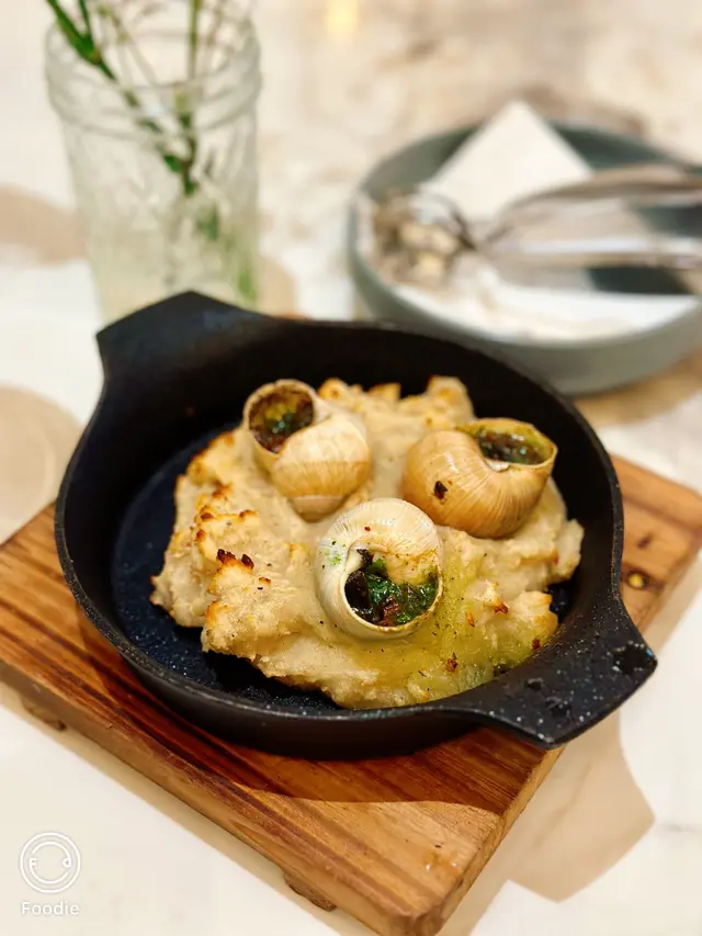 焗田螺以薯蓉墊底,加上香草,焗得香口,熱辣辣