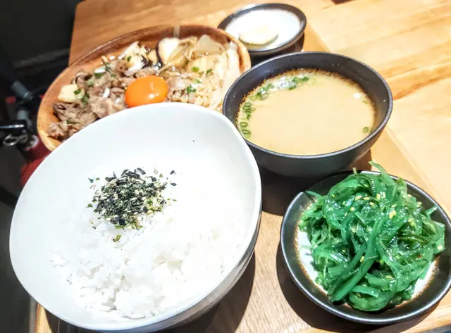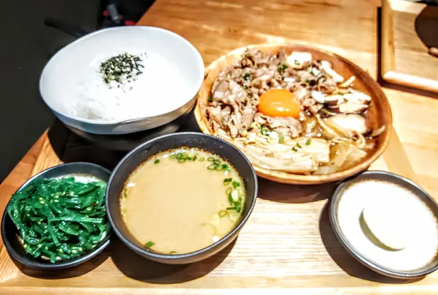 牛肉壽喜燒配和式定食,新鮮的壽喜燒配菜配香醇的壽喜燒汁,鮮甜味美。定食有泡芙作甜點,香脆可口!意想不到,小小的一間食店,能用心製作美味的食物