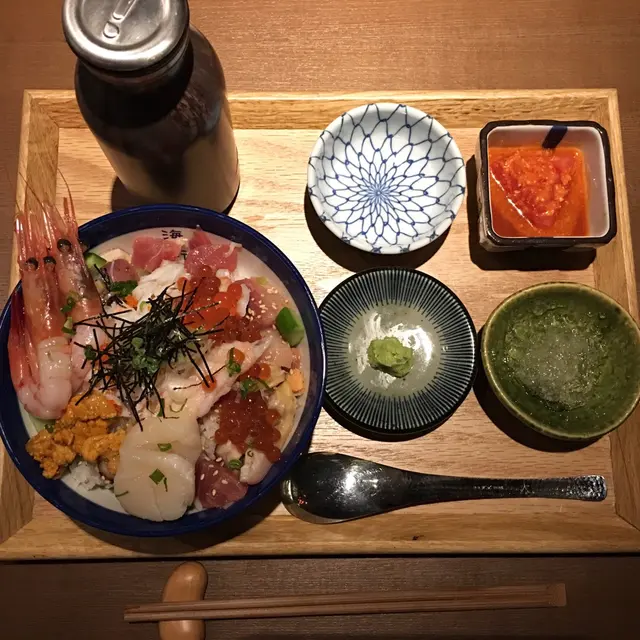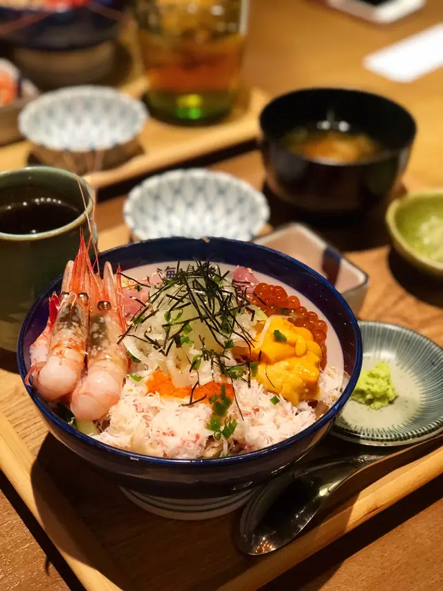 路經此地,發現新開的日本海鮮丼餐廳,研究一下餐牌,見圖片賣相不錯價錢合理,便決定進去一試。餐廳佈置很有日本情懷,感覺像置身日本地道餐廳一樣。午餐由$80起至$150 ,有湯有前菜,有這種格局環境感覺算便宜。前菜是店舖自家的特色辣番茄,味道不錯,感覺開胃。點了特上海宝丼,非常足料,食材新鮮,賣相亦非常好,海鮮舖得滿滿,有雪場蟹肉、三文魚子、海膽、甜蝦、章魚、小扁背。日本咪煮得剛好,粗未與溫度適中,非常好食。整體來說是家高性價比的海鮮丼店,這裡的海鮮丼頗有特色和一般海鮮丼有點不同,海鮮不只是魚生或海膽,用到真雪蟹和貝類是比較少有的。這樣的價錢有機會經過附近都會再返來光顧。…查看更多