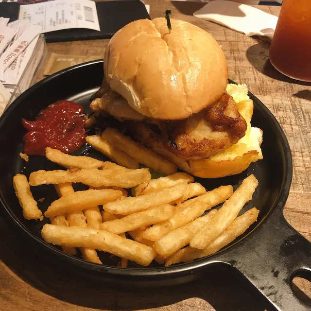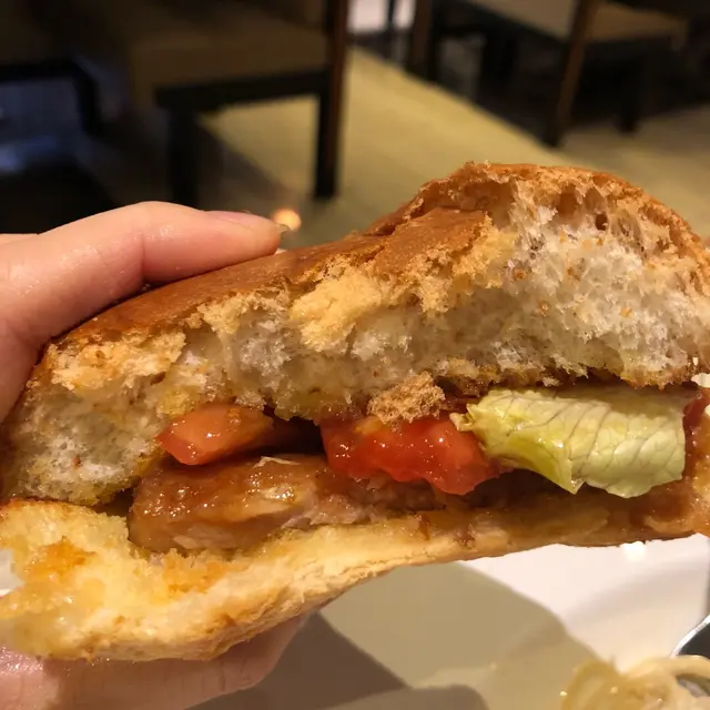 個包好香好大個,好厚,非常鬆軟熱辣辣,包內有塗了層牛油,有生菜蕃茄千島沙律醬和薄薄的炸豬扒,好邪惡啊!但真係好好食,食完會成日掛住想食