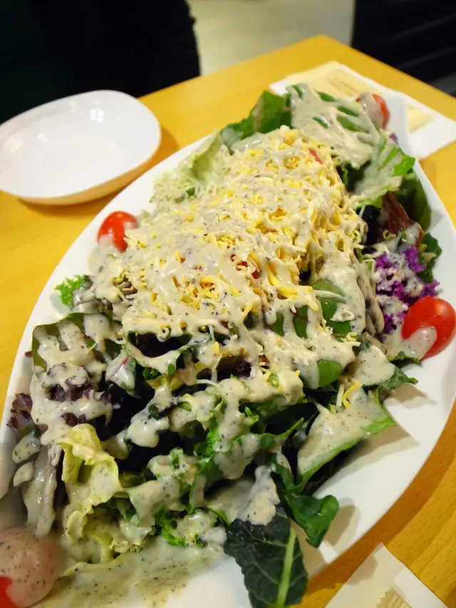 炸雞實在是一種太邪惡的美食,所以一定要點沙律來平衡一下,罪惡感也應該會跟著下降一點點吧。田園沙律由十多種新鮮蔬菜組成,每一口也有脆脆的口感,而且它們的味道都會不一樣,所以不要覺得吃菜就是牛吃草,吃這個沙律真的是一種享受,喜歡吃菜的朋友也一定會愛上它。上面一團團的是芝士,底下會有幾片雞肉,加上麻油香四溢的胡麻醬汁,讚啦!雖然這沙律索價不菲,但以份量(是三至四人份)和味道來講,我覺得是很值得!再來一盤炸雞腎,份量也是多到嚇死人。雞腎被炸漿均勻地裹著,所以吃的時候會有外皮酥脆的感覺,也有雞腎本身的嚼勁,兩者意外地合拍,再加上辣辣的醬料,簡直是三人行的最佳示範。待了二十分鐘,今晚的主角終於出現了!這份酸辣味炸雞應該是整整一隻雞的份量(哈哈,因為我有看到兩隻雞腿),所以也是很大份。先講雞肉,比想像中炸得嫩滑,就算雞胸部份也不會硬;外皮酥脆,炸漿一點也不厚,就輕輕的裹著雞肉;醬汁的酸味比較重,所以辣味也被蓋過,但非常開胃。女生的話應該吃兩件就很飽,所以可以多叫幾位朋友一起來吃,不過吃不完也是可以麻煩店員打包,外帶回家享用。附送的醃蘿蔔,酸酸的味道正好中和油膩感。…查看更多