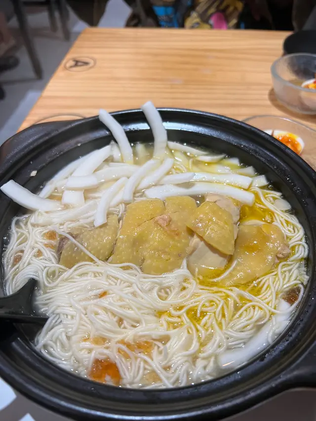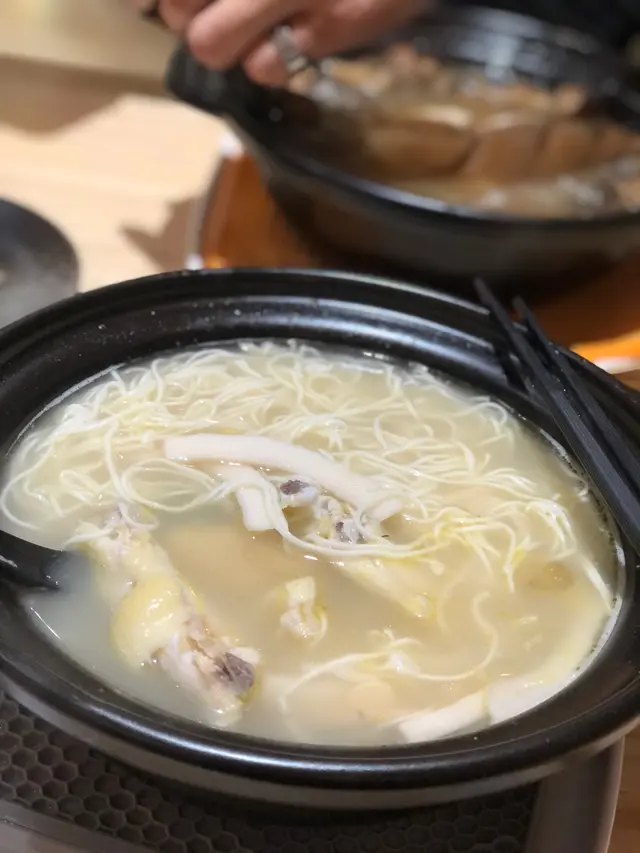 夜晚喺葵廣巡咗一圈,最後揀咗呢間舖,排隊排咗半個鐘左右就有位入。原來係坐細枱,細枱會坐得有啲侷促,而枱底有細勾可以勾起啲袋。之後店員見有大枱空出嚟就安排我哋兩個人轉枱,而下一個只有一人就坐我哋原本坐嘅細枱,店員都識靈活安排。兩個人最後總共叫咗3樣:砂鍋桃膠雪梨椰子雞,砂鍋水煮雞,雞湯蘿白。佢哋嘅出品同舖名一樣係湯同雞,首先湯底夠雞味,係好味嘅,唔似味精湯,其次啲雞都算唔錯,小食蘿白有驚喜,食到好飽,如果遲啲有機會嘅話會二訪。…查看更多