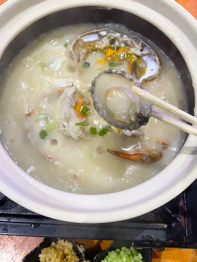 呢間餐廳消費滿150蚊就可以加1蚊食雞煲,都幾抵食。因為天氣凍凍地,我哋點咗砂鍋粥,可以自選海鮮配料,揀咗海蝦和脆脘片,海蝦有半斤份量,兩個人好夠食。熱粥再加啲蔥花、菜脯,粥底鮮味清甜。海蝦新鮮、脆脘片肉質結實爽脆。串燒方面:燒蒿荀,爽口清脆風味燒豬大腸,焦脆酥香,呢個口感唔錯燒鮮白鱔串,鱔肉爽脆彈牙金銀蒜原條燒茄子,軟糯拉絲,濃濃既蒜香味一元雞煲有半只雞,份量充足。雞煲醬汁濃郁,雞肉也幾嫩滑人均消費2百幾左右,喺尖沙咀嚟講算抵食!…查看更多