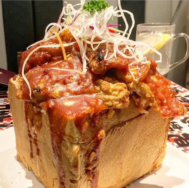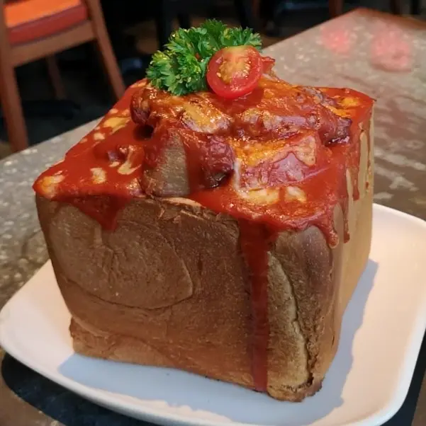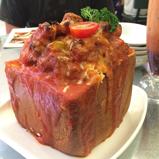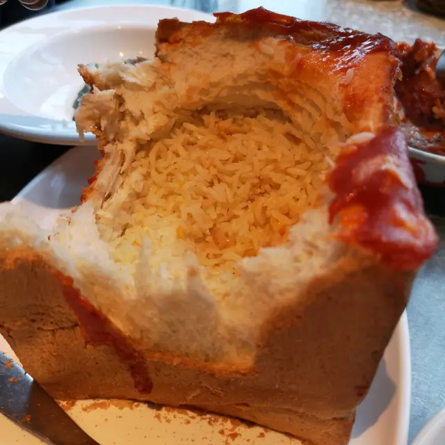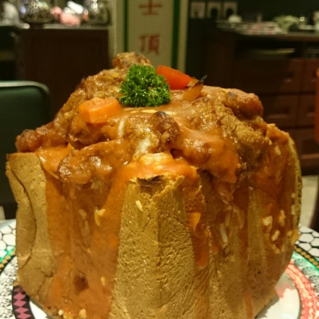 以未切成方包及未去皮的方包磚,盛載豬扒及焗飯!