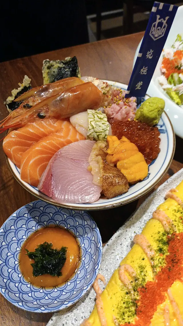 🇭🇰究極堂·呢間我喺之前見到有friend post佢個壽司拼盤好似幾吸引咁 所以就想黎食壽司 點知我地嚟到先發現原來佢個壽司拼盤係午市先有既🤣🤣所以我哋最後嗌左其他嘅嘢食😎·究極丼$218 l 活赤貝(1隻)$68帆立貝壽司$18 l 魚子醬赤蝦$18 l 槍烏賊壽司$18 l 蟹味噌蟹棒壽司$14 l 油甘魚壽司$20佢呢一個究極丼相當有驚喜 佢嘅魚生好新鮮 而且我好欣賞佢係有配一個蛋黃既 加埋蛋黃 入面既三文魚籽 吞拿魚蓉 撈飯好正😍😍🤤反而唔知點解我覺得我哋散嗌嘅壽司水準就一般 比較有驚喜係佢個活赤貝 佢望落好似比較少咁 但係佢係將個貝整咗做個手卷 出奇地好有口感 勁脆身😈·温泉蛋蟹肉沙律$78 l 炸雞軟骨配海膽醬$58之後佢個溫泉蛋沙律都唔錯 個沙律撈埋啲蛋汁幾好食🥗之後佢個雞軟骨都好好味 佢呢個係自己炸個啲黎既 所以個脆皮好薄 中間既雞軟骨都好大粒 超級送酒 我自己好鍾意🐤🍻·#rbyeat#rby日本菜#rby炮台山·📍北角蜆殼街9-23號秀明中心地下D號舖…查看更多