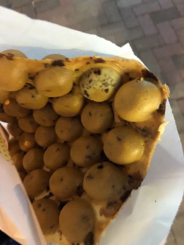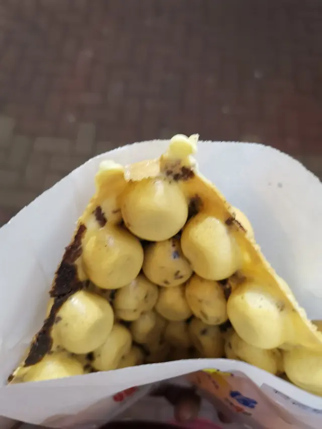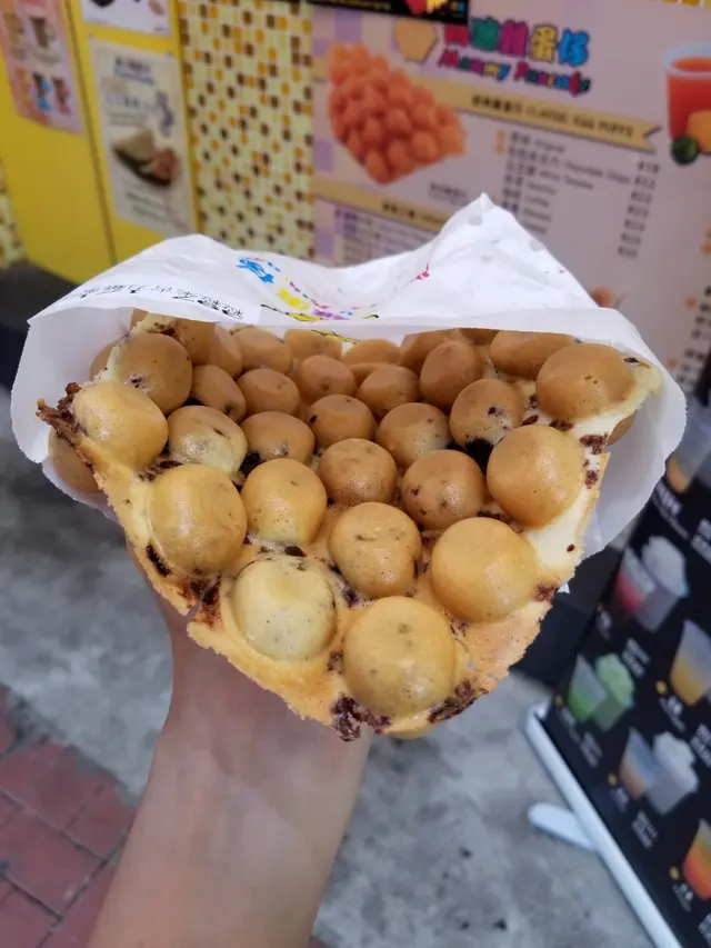 香港街頭小食中,其中最有名的肯定是雞蛋仔,大部分小食店都有賣最基本的雞蛋仔及格仔餅,至於「媽咪雞蛋仔」則是以多元味道選擇而聞名。這次來本來是想點芝士雞蛋仔,但因為很想吃朱古力,最後點了粒粒朱古力雞蛋仔及金莎醬榛子粒格仔餅。這家是即點即弄的,所以等的有點久。約十分鐘後店員叫到了我們的號碼,還叮囑我們小心熱食。粒粒朱古力雞蛋仔真的是充滿朱古力,喜愛朱古力的朋友一定要點,但對本人而言,只有它剛熱哄哄時我才真的覺得很好吃,久了有點太膩。至於金莎醬榛子粒格仔,真的像是吃餅夾大量的金莎