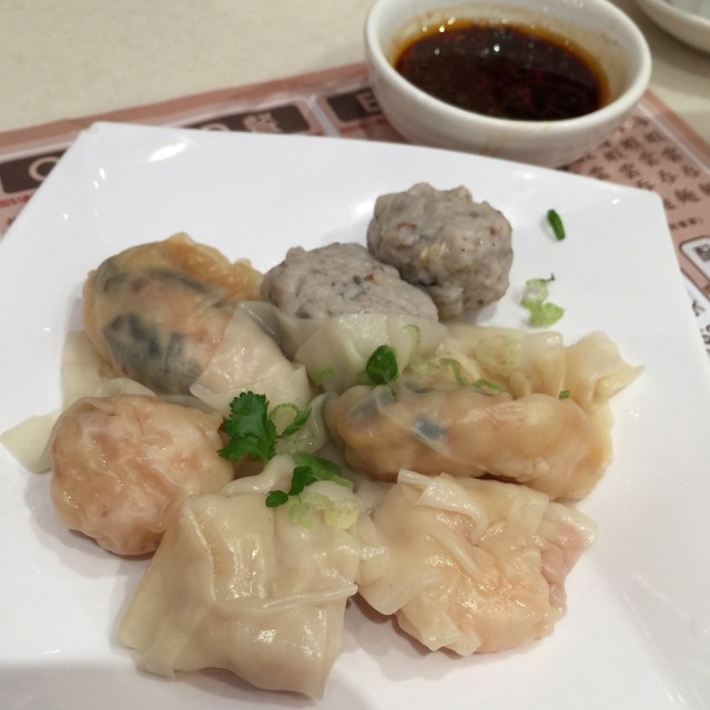 紅油三寶白灼鯪魚球、水餃、雲吞,每款兩粒,一個女仔絶對可以吃得完這套餐,以晚餐的份量來說略嫌少,各款味道不算得好食,鯪魚球不彈牙餡料又少又不夠魚肉味