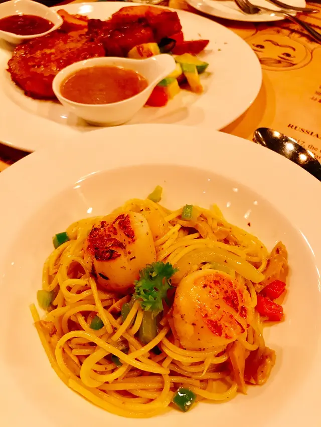 餐廳細細間,坐得舒服。少少俄式,又有少少中東色彩。有好多俄羅斯子母公仔,又有好多巨型 lego 公仔,好靚,好特別。waiter 好細心,會介紹食物俾我哋。推介香煎牛舌粒,好好好味,內軟外脆,未曾試過咁好味既牛舌