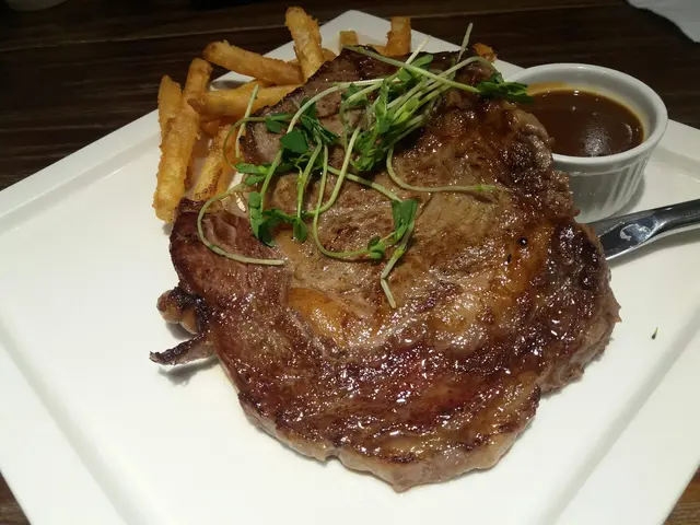 美國優質肉眼扒配葡萄酒燒汁跟香脆薯條及時菜