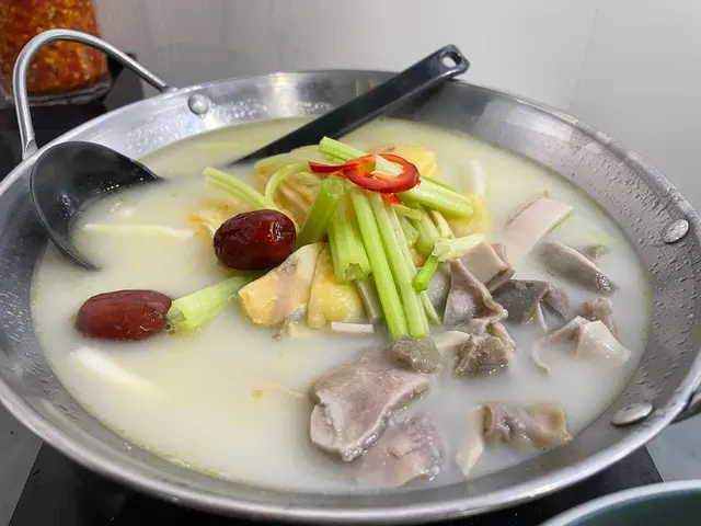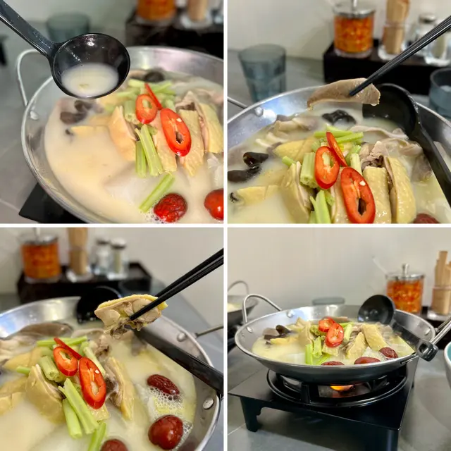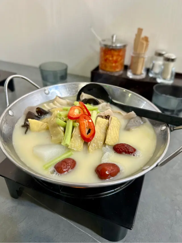 泰式豬頸肉 🍖🌶️首先試咗小食——泰式豬頸肉,豬頸肉切的厚度適中,醃製得恰到好處,重要係夠脆口,令開胃又美味!仲配左粒士多啤梨😂😂 仲要幾好食,感覺新奇同fresh花膠濃湯雞鍋(配雞湯米線 )🍜🐔我點咗花膠濃湯雞鍋,鍋底的雞湯無想像濃,不過十分清甜,味道鮮美,食完唔口渴。花膠煮得剛好,口感滑嫩,跟雞肉一齊食非常搭。配上雞湯米線,米線吸收咗湯底的鮮味,配上其他配料(主要有菌類同蔬菜)真係好滿足!胡椒豬肚雞鍋(配雞湯米粉 )🍲🐷然後試咗胡椒豬肚雞鍋,鍋底的胡椒味道濃郁,帶有一絲微辣,十分開胃。豬肚煮得軟滑,與雞肉一齊煮出嚟,湯底香氣四溢,配上雞湯米粉,簡直係絕配!米粉吸收咗湯的鮮香,食落去真係超級好味!(呢個配料無菜但有白蘿蔔,平衡番胡椒的燥熱,養生重視者)飲品 🍹🍵飲品方面,我點咗凍檸茶同凍奶茶。凍檸茶清新爽口,檸檬的酸味非常醒神;而凍奶茶則奶香濃郁,甜度適中…查看更多