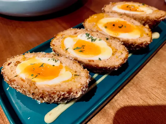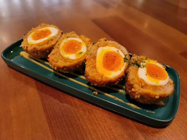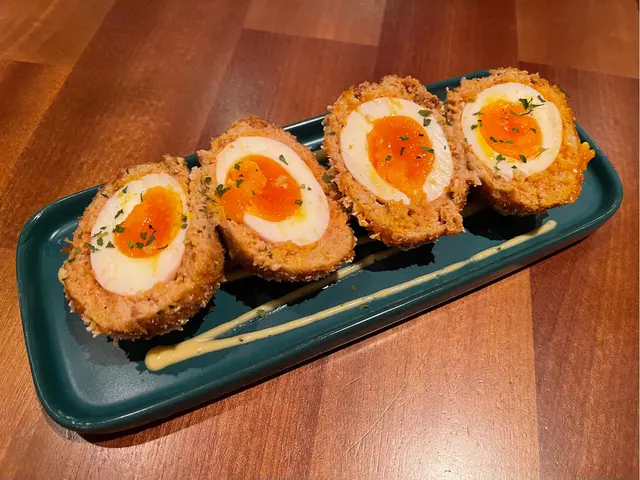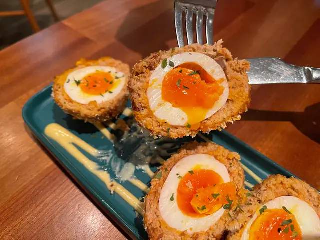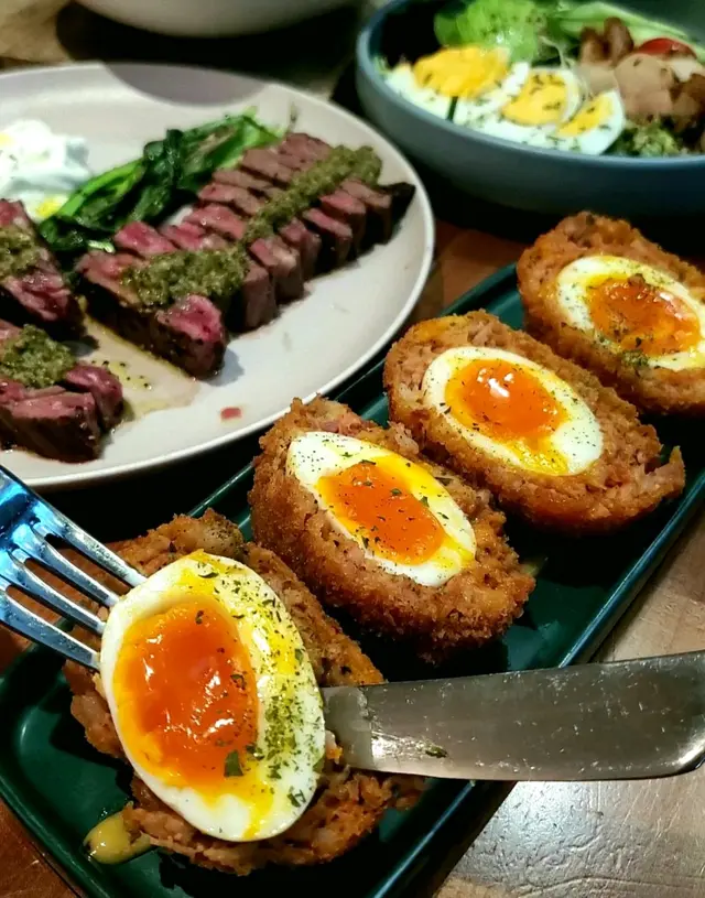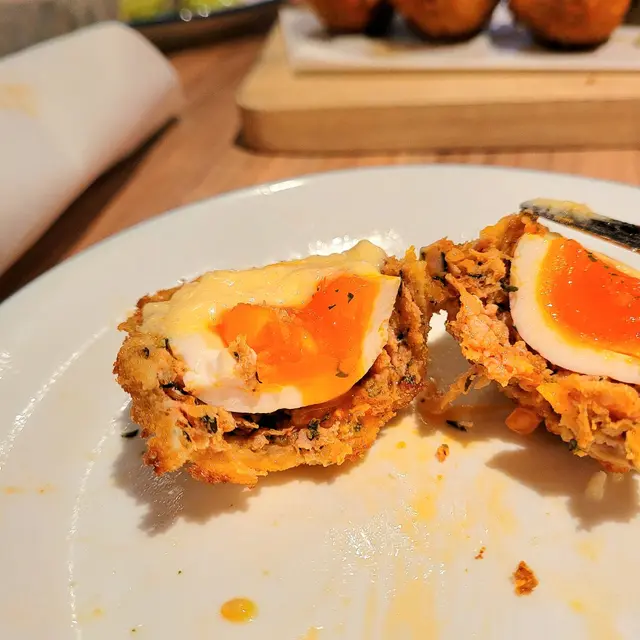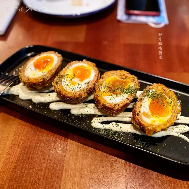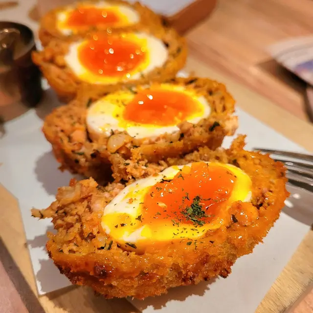 脆炸蘇格蘭蛋配風腸及蒜蓉蛋黃醬這個幾特別,蛋很大隻,裡面仍然係流心蛋,而外面係風腸既碎料再烤成,咬落去表層咸香脆味,裡面既蛋汁流心而滑。