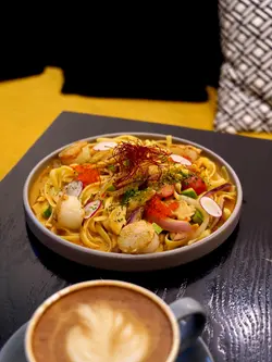 香煎帶子配樱花蝦龍蝦汁扁意粉