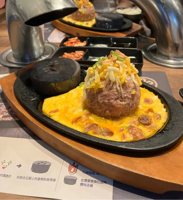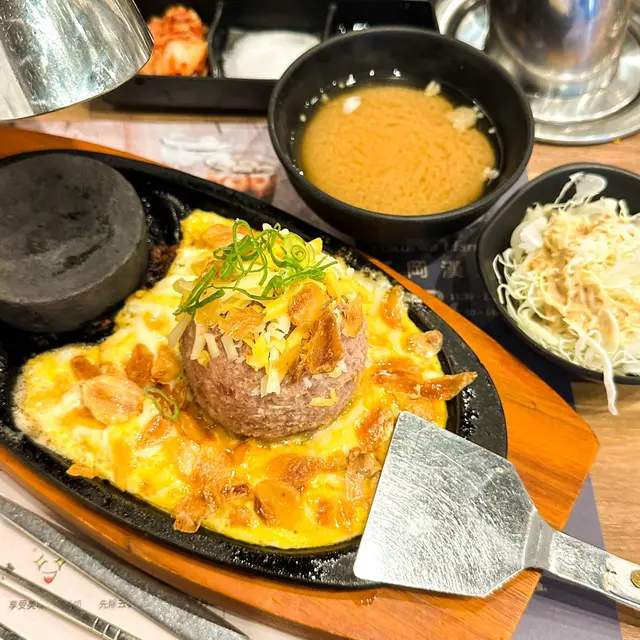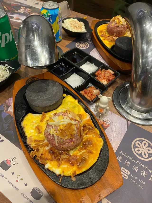 尖沙嘴厚福街食肆林立,競爭激烈下福岡漢堡扒一直都是排隊熱店,這次就來試試到底有什麼過人之處🍴每個人的座位上都配有抽風,另外有需要的話也可取圍裙使用。▫️兩人套餐 (ver.4)餐廳使用QR code下單,選擇困難的我們就直接點了兩人套餐。點餐後先送上醬料盤、味噌湯和清新爽脆的椰菜絲沙律佐胡麻醬🔸芝士蛋蒜和牛漢堡扒鐵板很快送上~第一次來吃,所以店員都有指導一下料理方法,先用小鐵鏟取部分漢堡平舖在熱石上再輕輕壓扁🤏🏼因為熱石超高溫的關係要每3秒翻轉一次,將和牛漢堡豐腴的油脂完全迫岀,喜歡焦香一點的可以多煎幾下,外焦內嫩仍保持 Juicy 口感!吃到一半的時候店員也有主動來更換熱石,自己動手料理感覺蠻有趣的👩🏻🍳 而且也很好上手🔹菠蘿煙肉和牛漢堡扒這款同樣扎實!多了菠蘿和煙肉的配料,吃法上帶來一點變化,吃完漢堡再吃片烤菠蘿很解膩。漢堡扒本身惹味多汁,再佐以鹹香迷人的芝士,所以我們幾乎沒用上醬料盤去調味🔸芝士泡豚丼套餐還有一個丼飯,超大一碗二人分享剛剛好。裡面堆滿了泡菜和豚肉片,加上拉絲的半溶芝士非常邪惡.ᐟ.ᐟ.ᐟ 🔹飲品附兩罐罐裝飲品,養生的我們就選了無糖的烏龍茶和樽裝水 💧 …查看更多