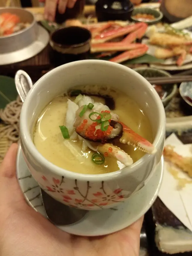 刺身係跟三種盛釜嘅,普普通通三種盛釜熱辣辣釜飯登場!內有大蝦一隻,蠔兩粒,香菇,鰻魚。我之前食過佢地嘅月見牛釜飯同三文魚釜飯,兩款都非常出色,今次食嘅三種盛釜飯就被比下去啦,大蝦冇味,蠔有小許腥,可能海鮮吾太新鮮,本應吸收左滿滿海鮮精華嘅飯變得略為失色。都好味嘅,不過吾夠之前食過果兩款咁正。蟹釜好多好多嘅蟹肉,三文魚子卜卜脆,個飯吸收晒蟹嘅淡淡清香,好食! 不過我同老公都係較重口味人士,會覺得略為淡左小小。釜飯份量頗大,一份可以𢳂到2.5碗飯,再加埋豐富嘅前菜,兩個人實在食吾落其他小食。趁佢仲有半價會再去試新野