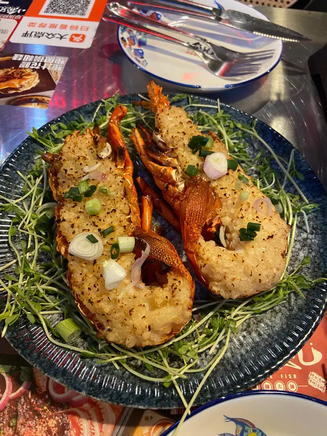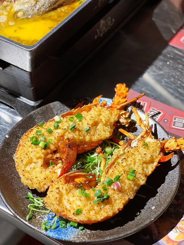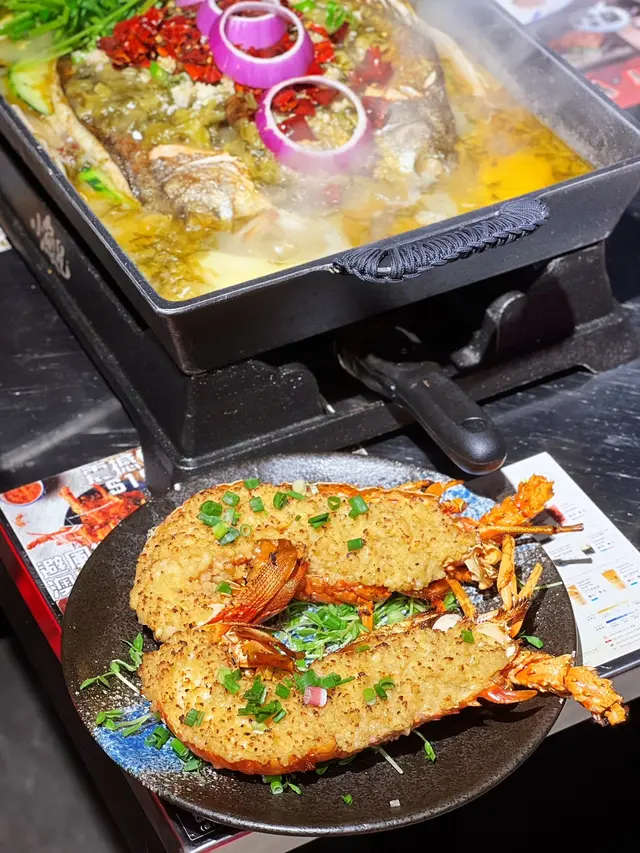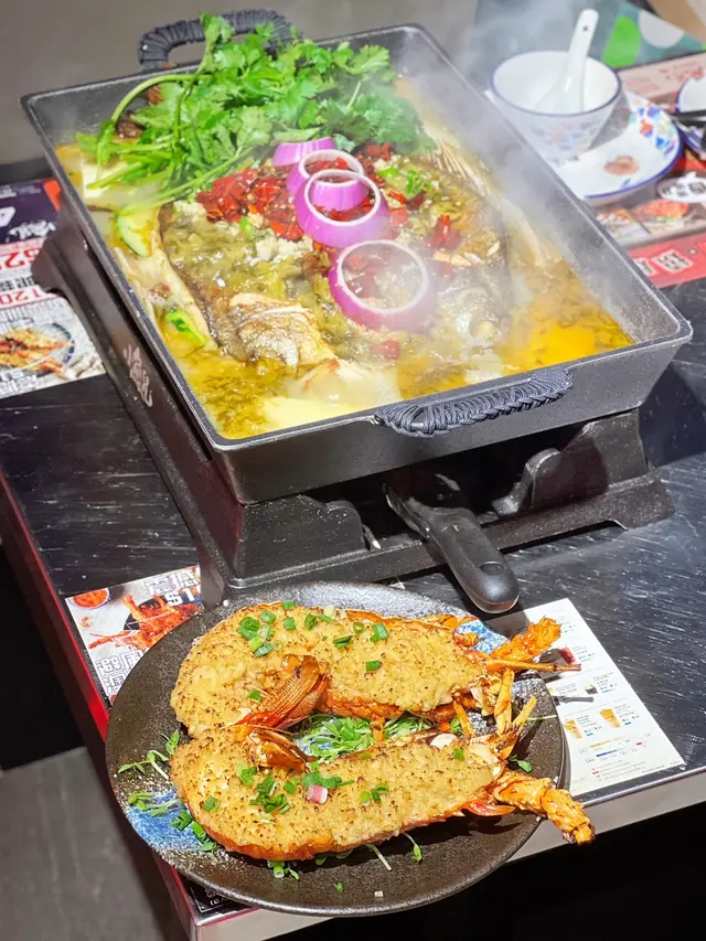 這間川菜館位於銅鑼灣的寶漢大廈,正正對著地鐵站C出口,主打性價比高的雞煲及烤魚等四川菜式。店內環境寬敞舒適,以型格的黑色為主調,更有霓虹燈等,適合多人聚會。剛巧遇到樓下派宣傳單張,分別有兩張優惠卷可使用。海鱸魚 - $308超大尾開邊的海鱸魚,先以碳火烤香充滿風味,魚皮變得香脆,切開肥美飽滿的魚肉好雪白,結實充滿彈性,骨刺較大易去骨,鮮嫩清甜無腥味,含豐富營養;老壇酸菜豆花湯底有著脆嫩的酸菜,酸爽勁道,麻辣刺激,還有芽菜、豆腐及寬粉。蒜蓉牛油燒澳洲龍蝦 - $198肉厚肥美的澳洲龍蝦,細滑柔順的龍蝦肉特別鮮美香甜又多汁,有少少甘香的龍蝦膏,再鋪滿惹味的蒜蓉牛油突顯其鮮味。燒牛肉串 - $23/串燒羊肉串 - $25/串四川式燒烤串燒,有多款香料口味選擇,每串均有豐富的鮮肉,嫩滑多汁而不乾柴,分別滿佈孜然和麻辣粉,濃郁惹味。飲品放題 - $28/位多款罐裝飲品,亦有自家製冷泡茶飲,無糖較健康零負擔。…查看更多