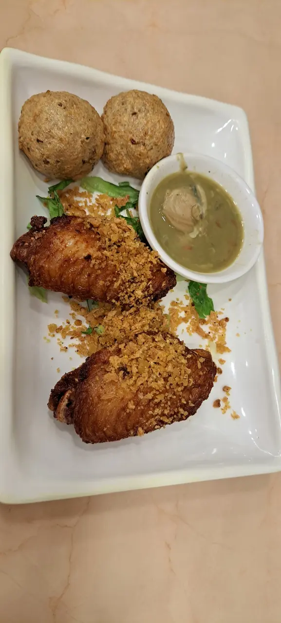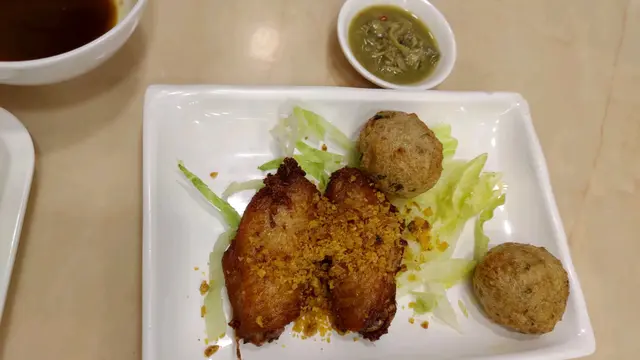 這天和朋友想吃中餐,便來到了這間位於佐治的盛記粥麵,餐廳寬敞明亮整潔,牆壁上還印有介紹雲吞麵和及第粥的故事,十分有趣。我和朋友點了兩個套餐,一個套餐有一款主菜、一一款小菜還有一杯飲品或一碗糖水。我們分別叫了麻辣口水雞飯、蒜香南乳炸雞翼拼炸鯪魚球和一碗雞蛋薏米糖水,還有飄香南乳豬手粗麵、炸兩和一杯熱薏米水,這些套餐性價比較高,還有很多選擇👍🏻這間餐廳的招牌飲品是薏米水,果然名不虛傳,熱騰騰的薏米水清甜解渴,添加了薑來中和薏米的寒性。朋友說他的雞蛋薏米糖水也很美味,還可以袪濕去水腫。炸兩是新鮮製作的,外軟內脆,香嫩幼滑的腸粉皮包著脆脆的油條,再加上自行調較比例的醬汁,很適合我這個麻醬愛好者😋蒜香南乳炸雞翼拼炸鯪魚球炸得剛剛好,雞翼和鯪魚球都很香脆,雞翼上的乾蒜和南乳醬汁很搭,鯪魚球也很美味有嚼勁。飄香南乳豬手粗麵的豬手份量很多,有滿滿的骨膠原,濃厚的南乳味增添了豬手和粗麵的風味,性價比高又好吃。麻辣口水雞飯用了雞腿肉,所以肉質新鮮嫩滑,雞肉的麻辣味令人胃口大開,把麻辣醬汁淋上白飯上,一口雞肉一口飯,很是滿足。下次再來試試及第粥和雲吞麵,必定會再點薏米水 👍🏻…查看更多