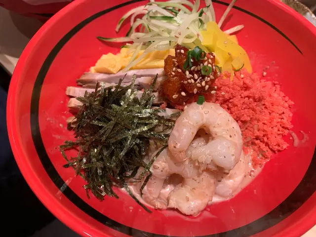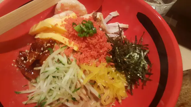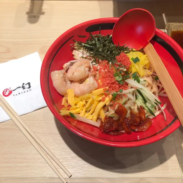 中環新開嘅一幻。店內裝修簡潔。以bar枱形式座位為主。有出水位同叉電位。安排細心。原本想食一幻有名嘅蝦湯。但見到有中環店限定嘅蝦汁胡麻冷麵。加上最近日日都三十幾度。二話不說就叫左冷麵。拉麵底用左粗麵。掛汁能力唔錯。胡麻汁同蝦味平衡得好好。有好多配料。除左蝦同叉燒。仲有切左絲嘅蛋醃蘿蔔青瓜紫菜。口感非常豐富。