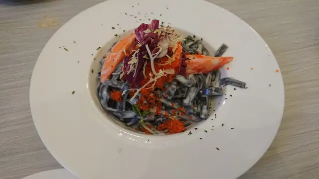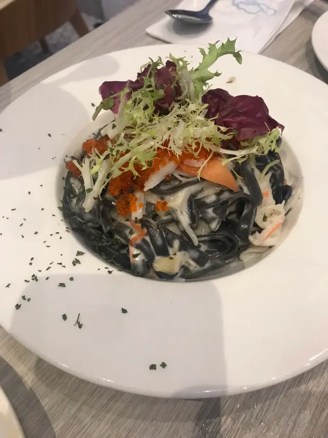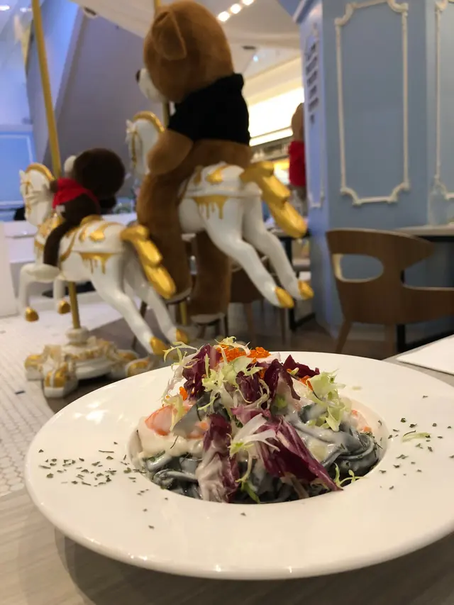 咁岩要黎杏花村工作,否則都好少會踏足呢個地方。由於唔熟路既關係,都係決定係杏花新城解決我既晚餐。商場内食肆都幾多,最後比呢間餐廳既裝修吸引左入黎。竟然係一個餐廳見到旋轉木馬,又唔係係主題樂園。餐廳内仲有好多不同既公仔,睇得出店主落左好多心思去裝修同佈置。Menu選擇都幾多,最後為左容易d揀就揀左個set。美式BBQ豬排骨 豬排骨好大條,幾乎同我既手臂一樣。望落色水唔錯, 切落發現其實肉比想象中小,但都飽既。旁邊有個醬汁,不過我就唔推薦點,因爲原本舊豬排骨已經好夠味。 蟹籽蟹棒忌廉意大利墨汁寬條麵 寬條麵上面鋪滿蟹籽,一d都唔吝嗇,撈完都仲見到粒粒既蟹籽係每條麵上。麵條食落都ok,但如果可以硬少少就更好。朱古力慕絲套餐仲父送左個甜品,好似每日都唔同,今日係朱古力慕絲,味道還可,略嫌少少硬。總括而言,呢度好適合有小朋友既家庭或者朋友黎,環境不錯,食物都ok既。…查看更多