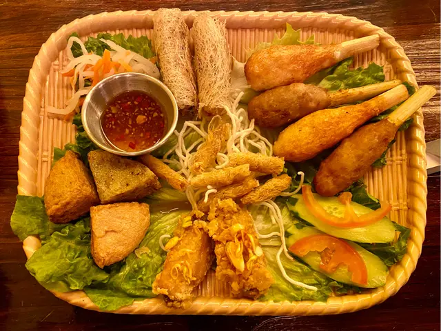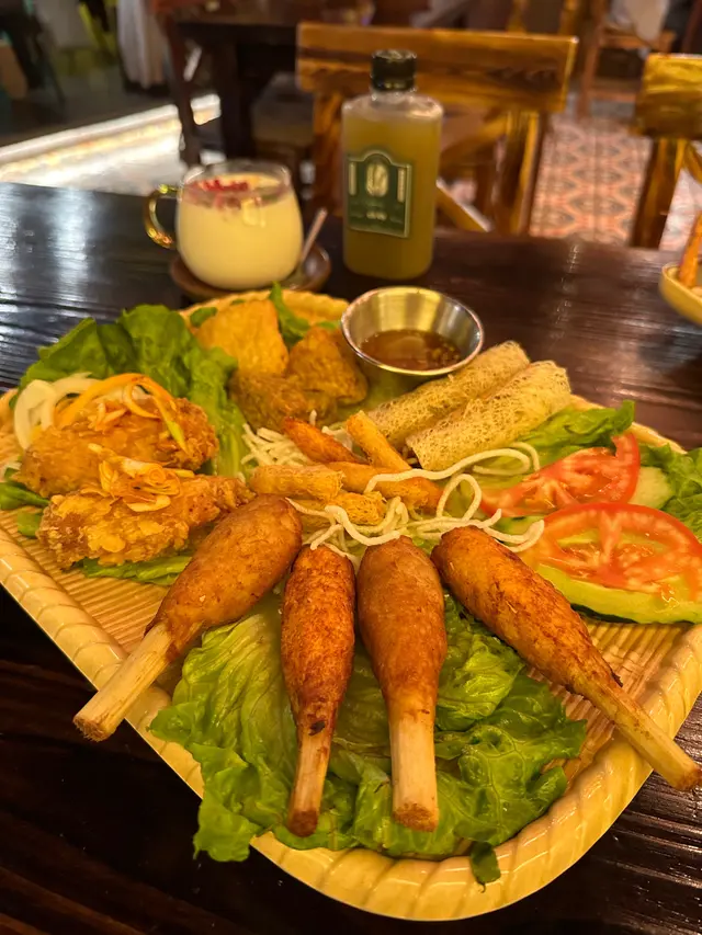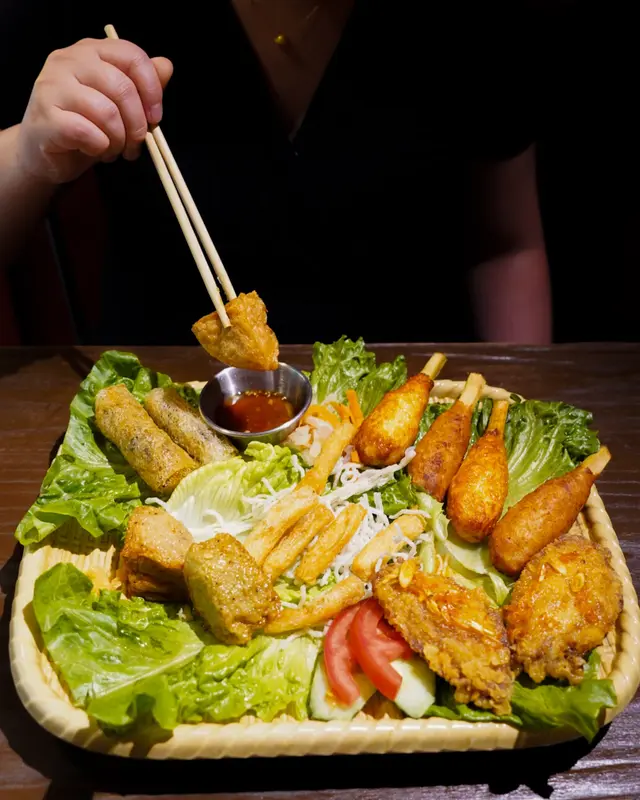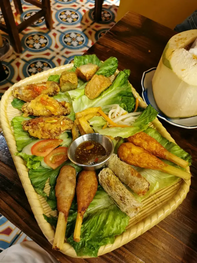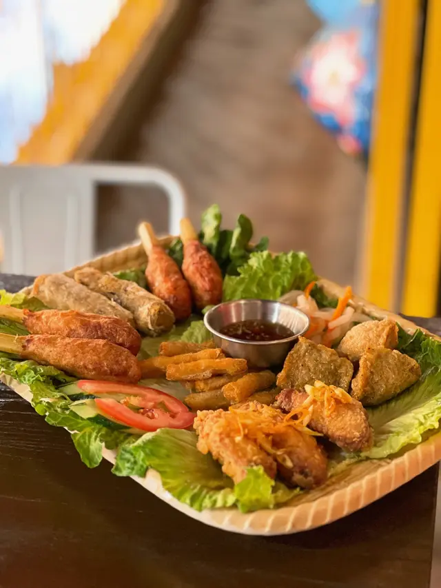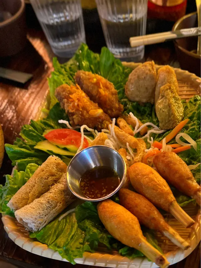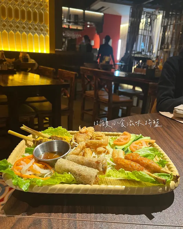 街頭小食滋味拼盤 有齊豬肉春卷、雞翼、扎肉、香茅牛串等小食,一班朋友share就最岩!比較印象深刻嘅係香茅牛串,配上餐廳自製嘅咸蛋黃醬,令食落去多左蛋香味,口感比較豐富。而雞翼用魚露醃過,已經調咗味,炸出嚟唔會乾身幾好食。反而扎肉比較普通,雖然話有三款口味,但食落分別唔大。而豬肉春卷都係脆啲嘅話會更好。…查看更多