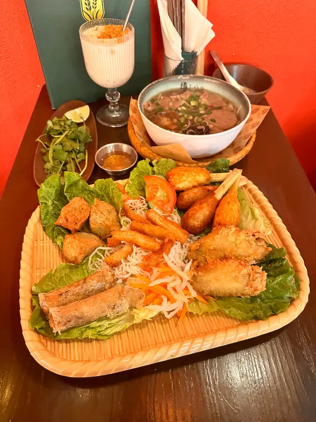 呢間餐廳主打傳統越南手工菜,標榜無味精,95%食材同多款醬料由越南直送到港🇻🇳樓上陽台掛滿富民族色彩嘅特色燈籠,令人感覺置身係越南會安🏮💗雜錦牛湯河 ($119)湯底以大量牛骨、牛肉、蔬菜熬製,味道甘甜鮮濃,清澈唔油膩🍲;檬粉依照越南總廚秘方,以越南米每日新鮮自家製作,口感順滑彈牙之餘,有香濃米香🍜;越南炒鮮牛肉鮮嫩腍滑;牛肋骨肉質柔軟纖細;牛扎肉同牛肉丸爽彈且肉味濃厚,鮮肉成份超97%,帶陣陣黑椒香;牛皮爽滑充滿骨膠原🐮牛湯河可跟從地道越式食法,混合甜辣醬、越南海鮮醬同青檸汁,更可加越式辣椒油同青辣椒粒,搭配湯河享用🥣💗街頭小食滋味拼盤 ($208)🦐甘蔗蝦串:將爽口彈牙嘅蝦膠包住甘蔗,令甘蔗甜味滲入蝦肉,味道更鮮味🐥香茅銀魚露醃製雞翼配秘製桔仔汁:雞翼炸得皮脆肉嫩,充滿肉汁,而且醃得香惹入味🐮香茅牛串配自家製鹹蛋黃醬:以牛肉包住原條香茅,令香茅味道完全滲入肉身,香氣濃郁,牛肉烤得啱啱好,肉質依然嫩口🫔豬肉春卷配生菜:米網春卷炸得鬆脆,內餡滿滿豬肉碎、香蔥碎、紅蘿蔔粒等。連同生菜同酸蘿蔔包住一齊食,有助中和油膩感💗酸甜柑桔汁無骨鳳爪 ($108)無骨鳳爪肥厚爽脆,啖啖肉夠哂方便🐓加入柑桔汁嘅醃製,味道特別酸甜清新,微辣開胃,加入適量香茅增加香味🍊💗斑蘭布甸法包配自家製椰子雪糕 ($128)法包選用米磨成嘅粉製造,堅持即叫即焗,口感特別酥脆🥖中間注滿軟綿滑溜嘅斑蘭布甸餡,斑蘭芳香清幽,甜而不膩🌱連同香濃嘅椰子雪糕一齊品嚐,同時感受到冷熱嘅口感衝擊…查看更多