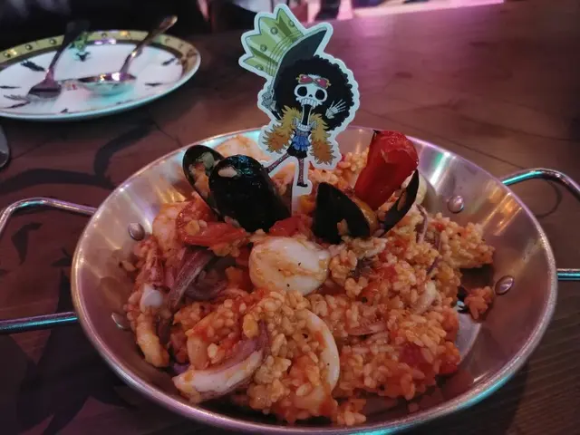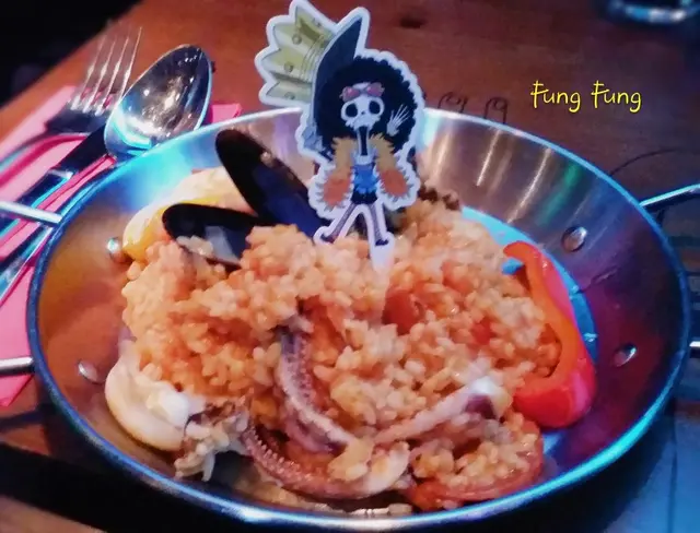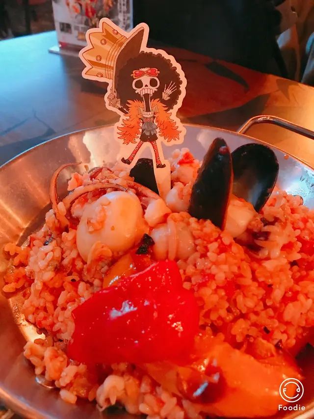 首次來到海賊王餐廳, 一入去就如置身在卡通片中! 除了有許多1:1模型外, 還有卡通主題歌曲高聲播放中, 很有氣氛! 環境裝置用心, 坐得舒服, 晚餐期間仲有幻燈表演, 具特色! 食物方面也不錯, 同朋友們點了四款食物, 兩個甜品share. 主食有Franky Super 漢堡, 西班牙海鮮飯, 忌廉菠菜繪雜菜球。漢堡除了有藍藍的漢堡包皮, 其肉多汁軟熟, 味道鮮甜, 在旁的星星薯餅也炸得香脆但不油膩! 海鮮飯汁香濃, 海鮮有蝦, 魷魚, 蜆肉, 青口, 墨魚等, 炒得香, 如果再乾身點更惹味。 雜菜球很有創意, 是十粒不同的蔬菜球, 包括紅菜頭, 青紅蘿蔔, 黃蕃茄, 車厘茄, 南瓜, 草菇, 薯仔等, 弄成球體再配以忌廉醬一同吃用,得意也美味。最後要讚兩杯芭菲, 阿羅芭菲和悲觀鬼芭菲, 滿滿的食材, 有雲尼拿雪糕之餘, 其草莓及荔枝味奶凍都好好吃, 啫喱亦彈牙香味! 值得一試! 如果是one piece 迷更要去, 享用美食, 又自拍一輪後, 更可在餐廳旁購買記念品, 認真愉快! …查看更多