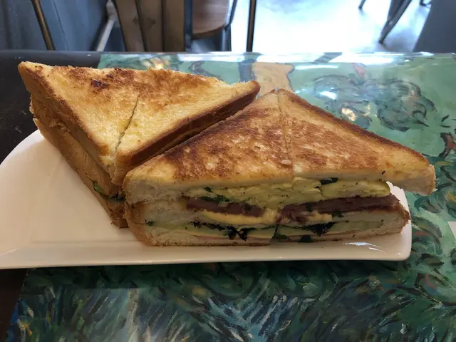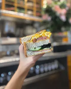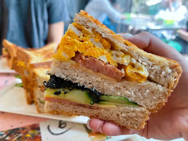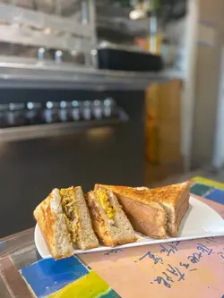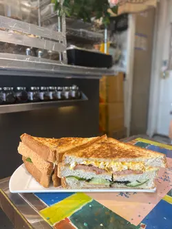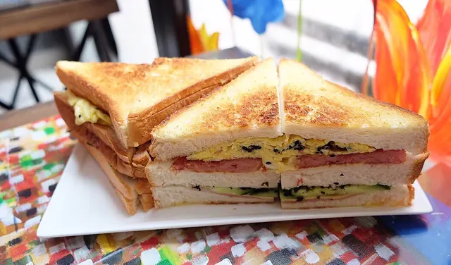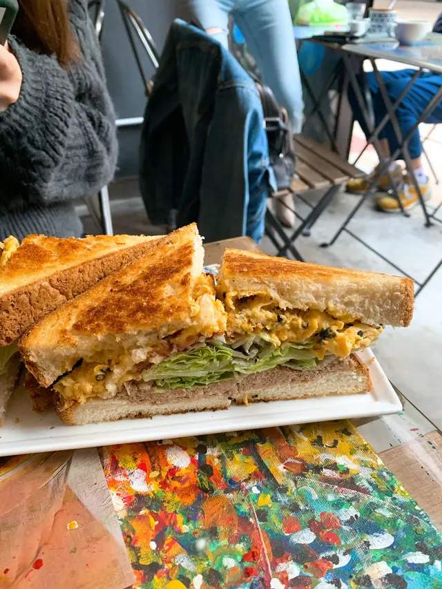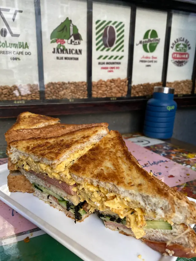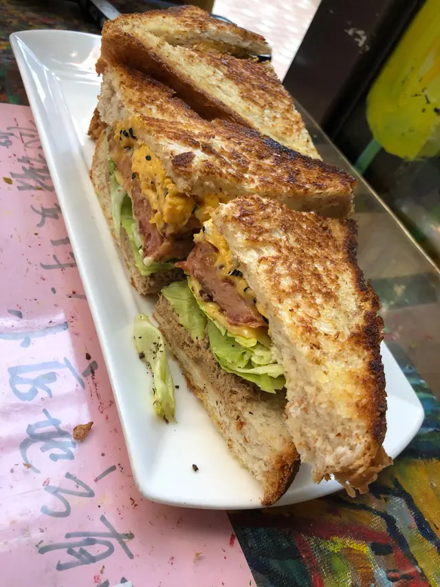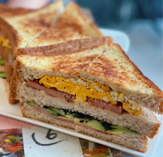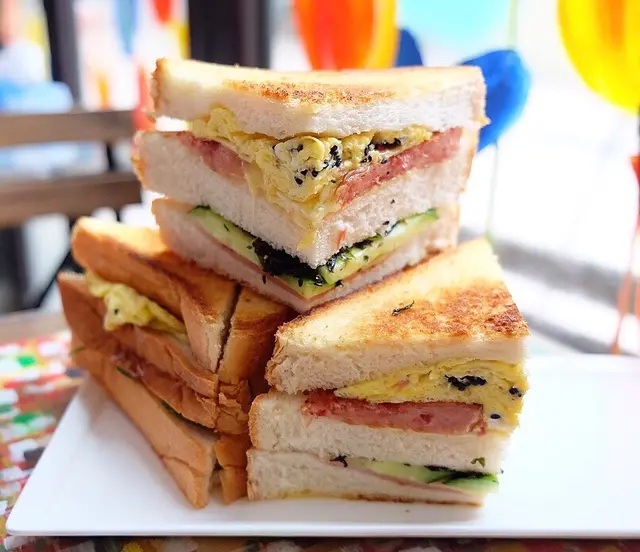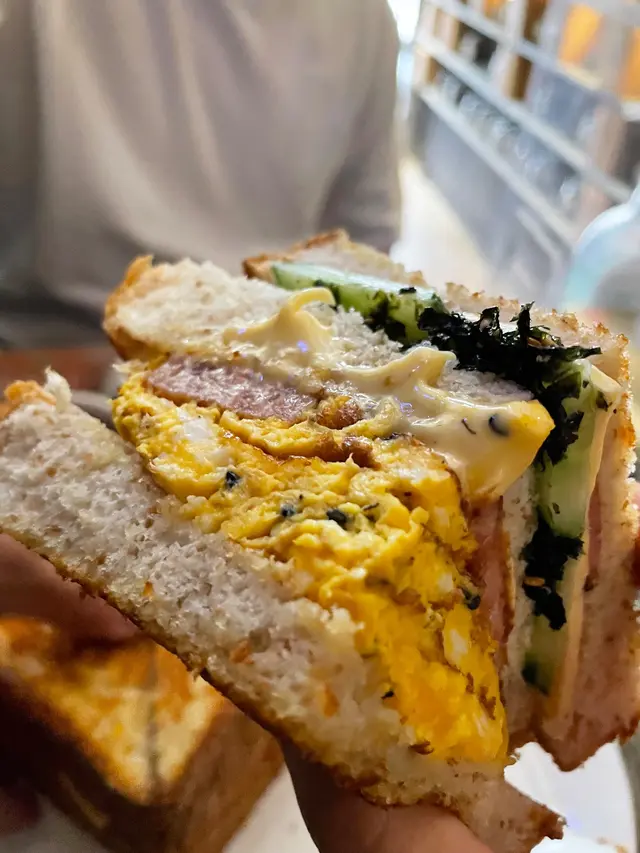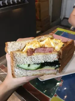 餐單看完餐單後,自助營式下單;小店提供紙及筆!三文治內有三塊烤過厚麵包,中間分兩層餡料;上層有炒蛋加黑芝麻、午餐肉、芝士;下層有海苔、青瓜、芝士
