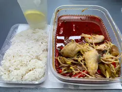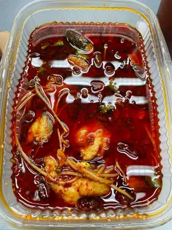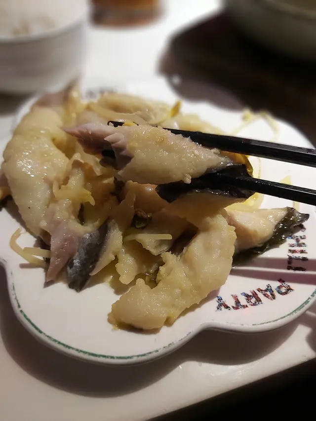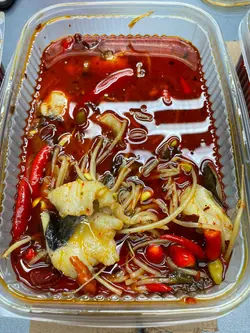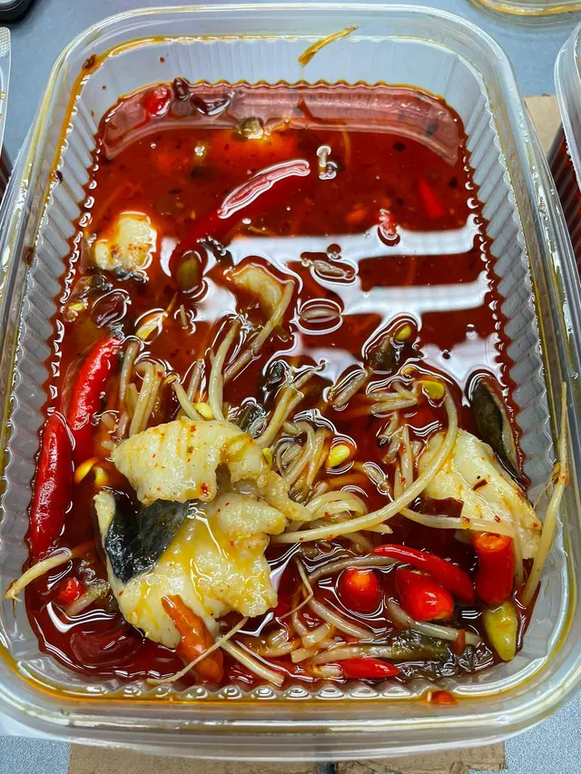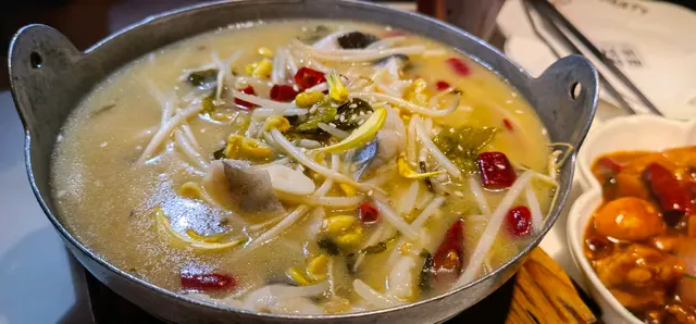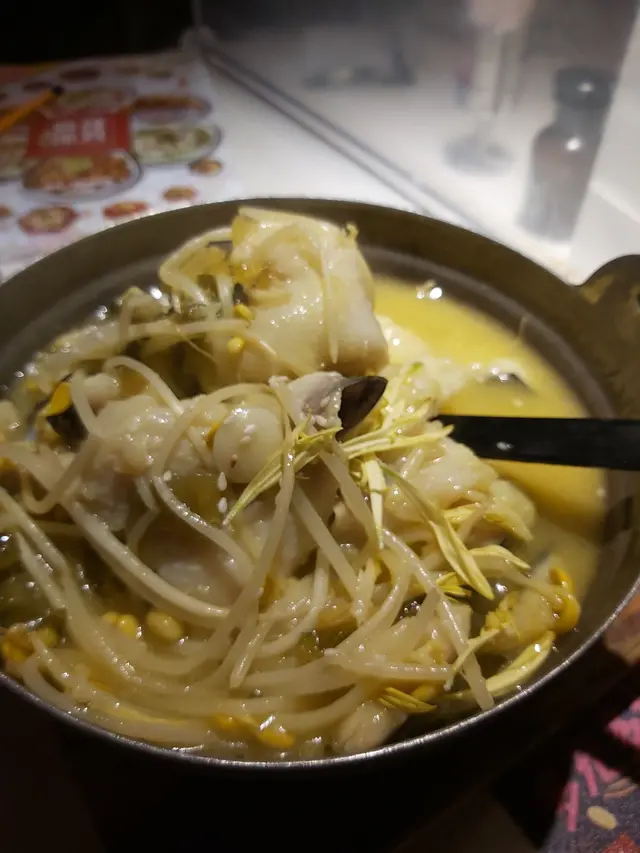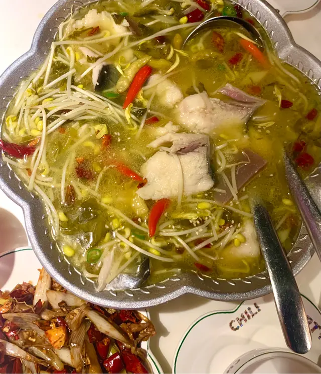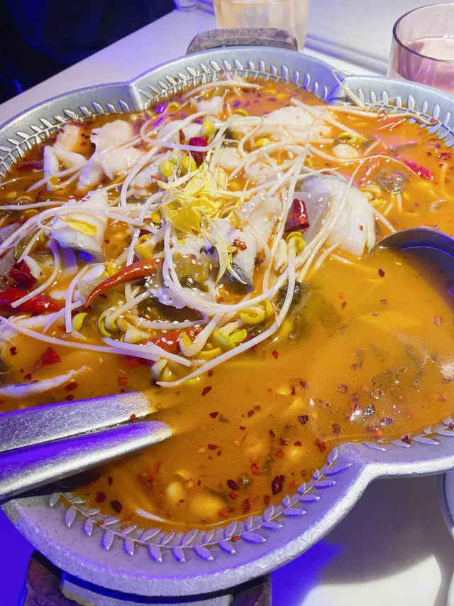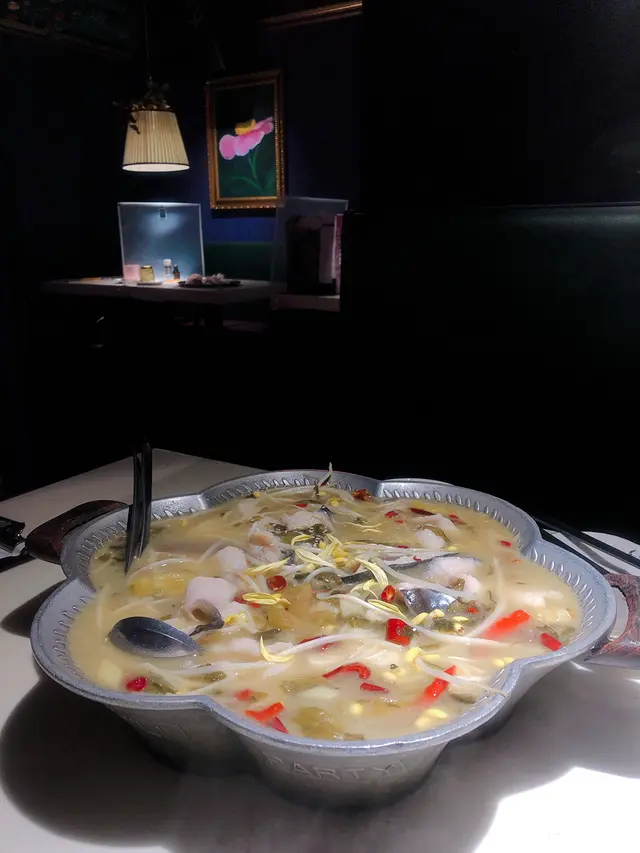 麻辣派對, CHILI PARTY, 銅鑼灣金百利廣場, 4樓.燈光迷彩. 一間好夢幻感覺的餐廳. 地上投影很吸引眼球, 餐廳內氣氛有點浪漫, 好像正在開 party, 天花掛滿彩色繽紛的花球, 佈置好吸引,有多部螢幕電視, 正播放明星節目,每個座位都有燈飾, 令客人坐得舒適. 店員招呼很好, 送來暖水及餐牌, 食品有海產,燉雞, 羊胺, 大魚頭.....酸辣鍋系列 , 麵食等, 可辣可走辣, 豐儉隨意.我們點了酸菜江團魚走辣.熱鍋上臺, 好大盆, 好睇好食. 有魚多塊, 魚肉白雪雪好嫩滑, 真豐富.配料有酸菜, 竘蒻, 芽菜, 寬粉, 吸了酸菜湯味, 好開胃. 湯底金黃色, 酸酸地好滋味.寬粉好稔滑, 芽菜幾爽口.水晶粉吾多, 煙韌彈牙, 夠滑口.大刀牛肉小麵, 賣相吾錯, 夠熱調味正. 牛肉好大塊, 份量不少.紅燒排骨小麵, 排骨有多塊, 又有少少肉碎, 小麵 好掛湯, 食得好開胃. 炸花生好味.枱上有提供 "魔鬼辣椒粉", 細看瓶上的提示, 朋友可以互比高下, 看誰可以吃得最辣.