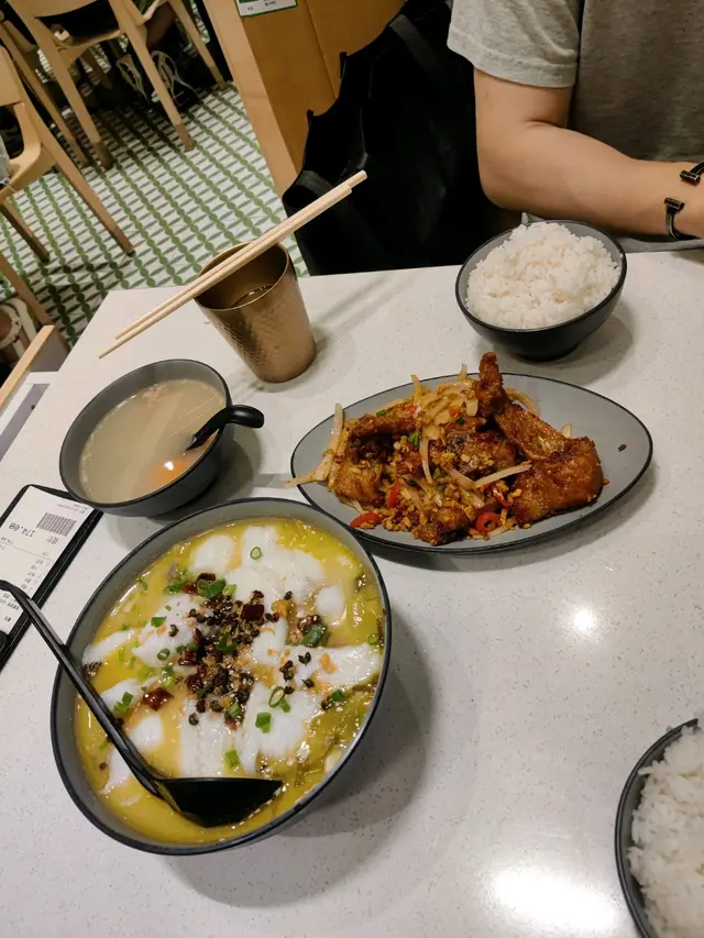 招牌酸菜魚酸菜魚近年深受我哋喜愛,我家住附近,就要來八月茶室食他們的酸菜魚鍋,食過第一次之後,就一直都好中意食,今次黎到當然唔例外!湯頭酸辣香濃,魚片滑溜,沒有腥味,相當開胃!湯內有份量十足的萵筍,萵筍口感爽口,令魚鍋更有層次,加上適量酸菜,仲有芝麻香味,惹味非常!水晶粉既彈牙又充滿酸辣香味,一流 !紅燒豆腐斑腩每一件頭腐也大大件,豆腐煎到呈現漂亮的金黃色,外脆內嫩滑,醬汁的吸收在豆腐,十分入味。這是我最喜歡班腩,魚味濃厚,而且有豐富的骨膠原,正重慶雞煲出面餐廳不是容易食到好味雞煲,而這裏的是非常出名,所以就點了一份重𪊴雞煲,一上桌時,整個大鍋充滿着蒜頭,紅紅辣椒,心想一定是十分惹味,嚐一口已經濃味強勁。這份雞煲的份量十足,雞件經炒過肉質仍保持鮮嫩。…查看更多